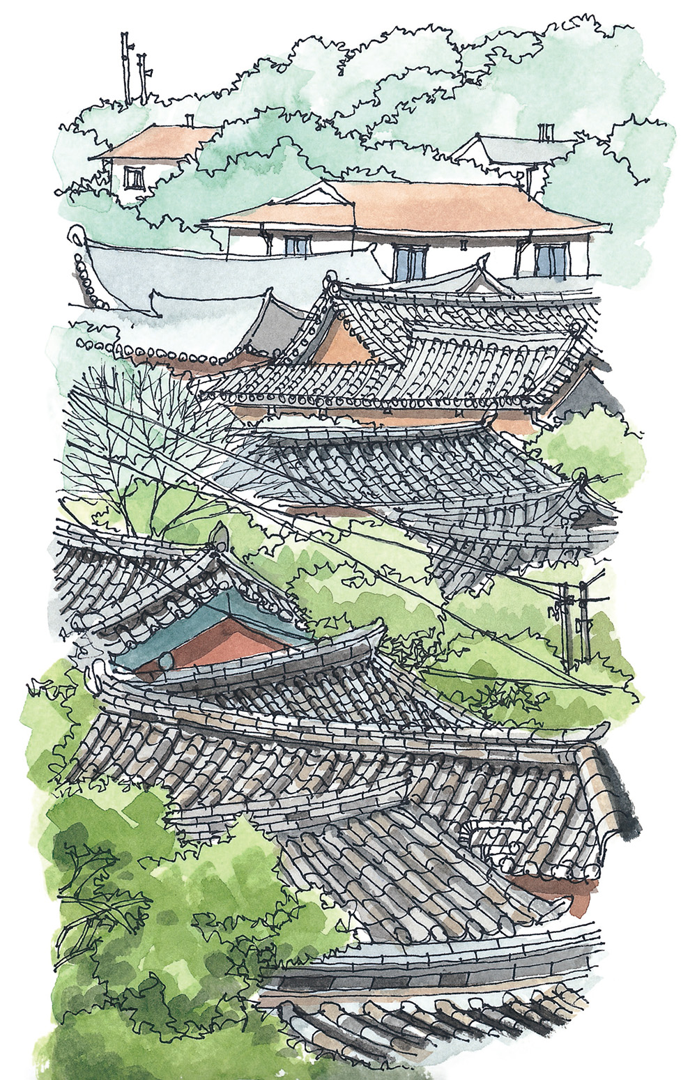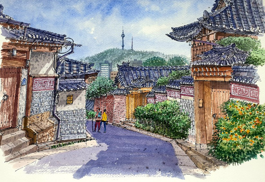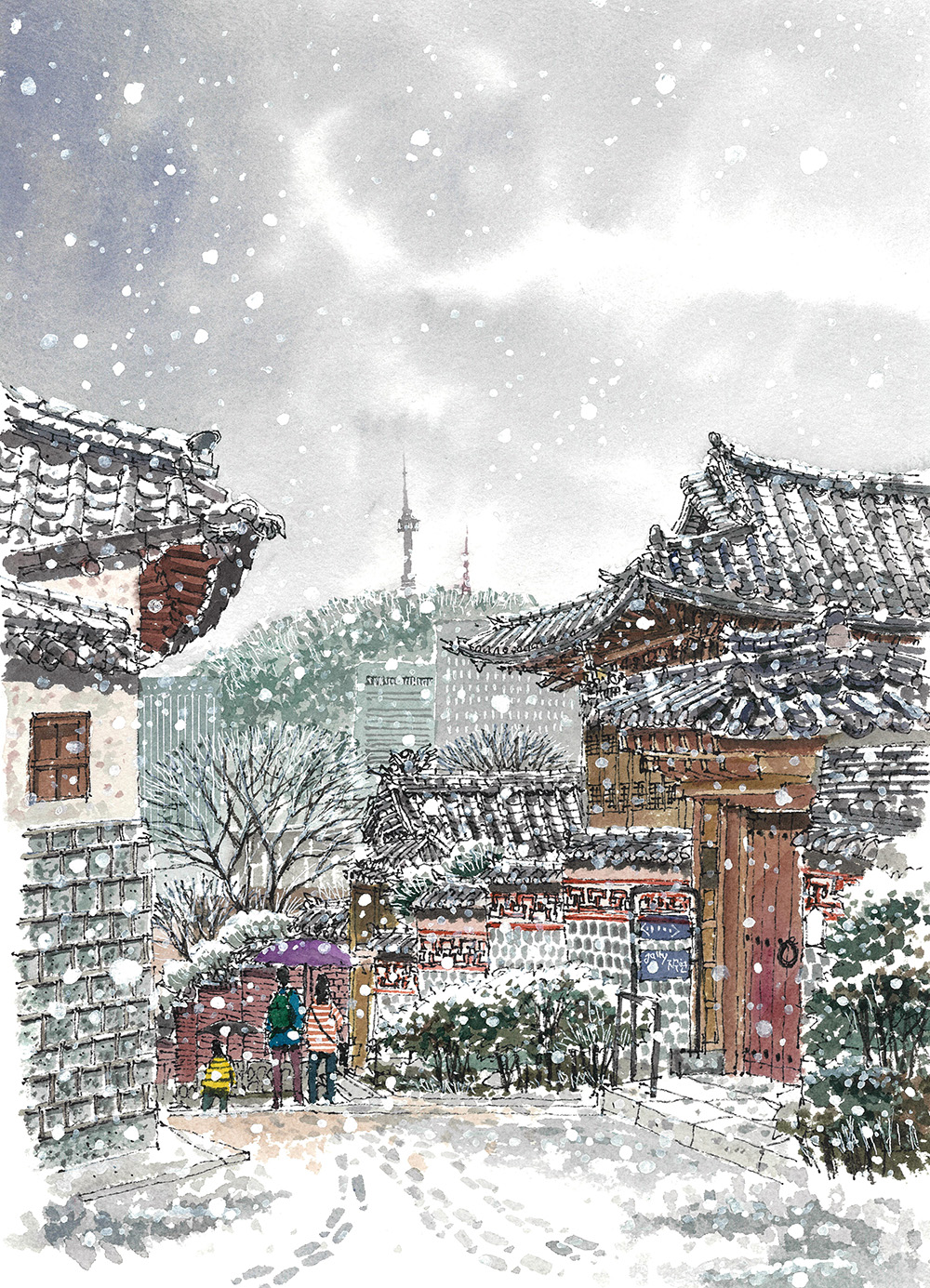 지우헌 앞길 지우헌 앞길 600년 역사를 간직한 대한민국의 수도, 서울의 정체성은 한양도성을 비롯하여 오래된 궁궐건축과 면면히 이어져 온 전통한옥들이 잘 나타내준다. 특히 북촌과 서촌에 남아있는 가옥들은 주민들의 삶과 일상으로 이어지며 오랜 역사를 지닌 서울의 자랑거리 중에 하나다. 몇 년 전, 서울시에서 북촌 한옥마을을 주제로 홍보용 탁상 캘린더를 제작했는데 그때 우연히 기회가 되어 북촌풍경 그림을 그려서 재능기부하게 되었다. 그 이후부터 서울에 보존되고 존치된 전통가옥들에 대해 조금 더 관심을 갖게 되었다. 그리고 주말에 시간이 날 때마다 경사진 골목길을 답사하면서 한옥들을 그림으로 기록하는 일은 나의 중요한 일상이 되었다. 한국의 전통 건축양식으로 지은 집을 통칭하여 '한옥'이라고 한다. 이러한 한옥들과 골목길 풍경을 몇 장 소개하며 독자들께 답사를 권유하고 싶다. 서울 시민들은 잘 알고 있는 친근한 장소들이지만 스케치를 통해서 본 한옥 풍경들은 조금 더 서정적이고 감성적인 느낌을 전달해 준다.