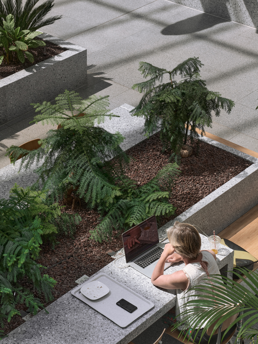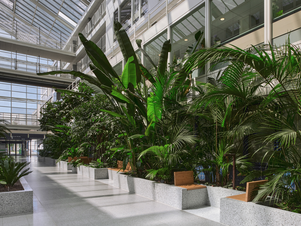 원래 입면을 따라 드문드문 배치되어 있던 녹지는 대리석 벽을 두른 높은 화단의 무성한 잎사귀와, 그 사이의 대나무 좌석으로 바뀌었다. 식물들은 홀에 맞닿은 방의 사생활을 보호하고, 상층부에는 내부에서도 녹지를 볼 수 있게 한다. 기존의 붉은 엘리베이터는 소파와 그랜드 피아노가 있는 새로운 두 개의 붉은 영역으로 강조했다.