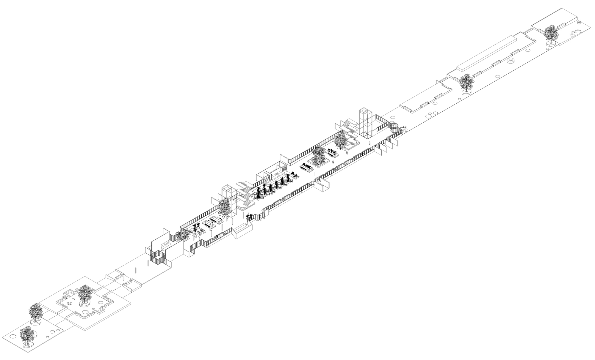 새로운 홀은 원래의 명확한 경로를 유지하지만, 푸른 잔디밭 사이에 앉을 수 있는 다양한 장소와 함께 지름길을 형성한다. 이를 위해 구내식당과 매점, 환자를 위한 서비스 공간과 미용실을 홀 양쪽 푸른 입면의 공간에 배치함으로써 여유 공간을 확보했다.