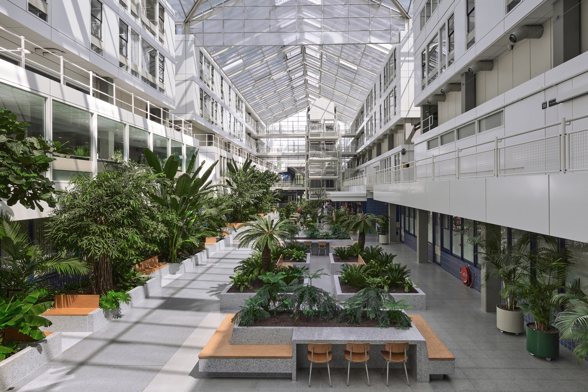 천장이 열린 중앙 홀은 크게 변형되었다. 원래의 디자인은 가로등, 녹지대, 정자, 우편함, 그리고 벤치가 있는 넓은 실내 거리였다. A에서 B로 빠르게 이동할 수 있도록 배치된 넉넉한 공간이지만 대기하는 장소로는 적합하지 않았다. 그러나 오늘날에는 디지털 예약과 앱 덕분에 외래 진료나 치료를 기다리는 행위가 병동 자체에서 이루어질 필요가 없어졌다. 방문객이 건물 내의 다른 곳에서 대기할 수 있는 이런 상황은 공간이 변화할 필요성 혹은 가능성을 의미한다. 이곳의 중앙 홀은 외래 진료실의 고전적인 대기실을 대체한다.