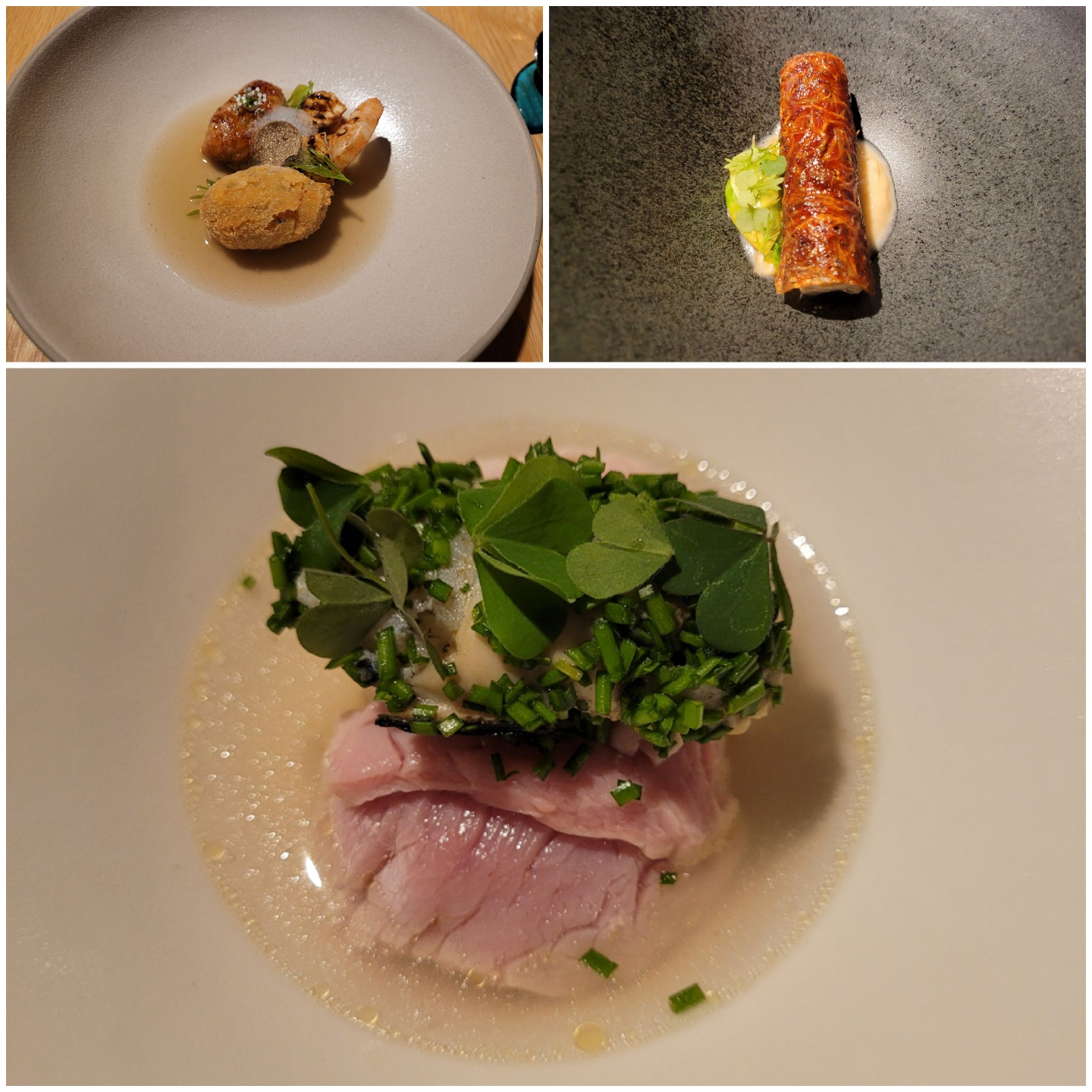 소물리에가 추천한 와인 페어링 코스로 정하고, 음식에 앞서 맛본 첫와인은 프랑스 루아르 계곡산 화이트 와인으로 드라이하고 미네랄향이 전해진다.말린 갈색 보리와 함께 플레이팅 하여 가을 느낌을 물씬 풍기는 첫 요리, 아뮤즈 부쉬는 가득찬 연기 향을 입히는 이색적인 퍼포먼스로 입과 눈을 즐겁게 하였고, 햇볕에 말리고 갈무리한 호박을 조청과 꿀을 섞어 만든 호박 정과와 나뭇잎으로 예쁘게 장식된 전어도 가을을 느끼게 하였다. 이어 나온 미니 버거는 미니어처 분재처럼 귀엽고 앙증맞아서 한입에 넣기가 공연히 아깝고 미안한 느낌이 들었다.