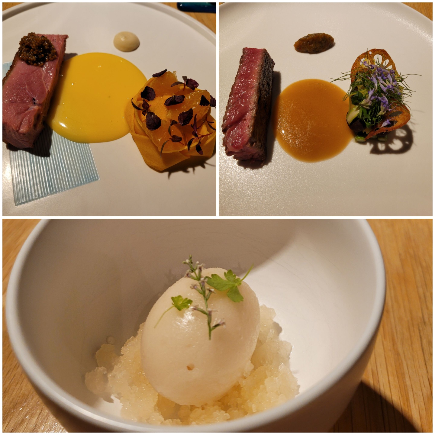 저민 호박으로 만든 한송이 꽃의 도움을 받은 오리 요리와 아스파라거스, 연근 등의 도움을 받은 한우 스테이크 모두 맛도 훌륭했지만, 그에 더해 식재료의 창의적인 조합으로 이룬 후안 미로(Joan Miro)의 그림 같은 플레이팅이 더 감동적이었고, 함께 한 레드 와인의 향이 입안을 감싸준다. 이어서 나온 매실 동치미는 시간을 절여 만들었을 국물을 얼려 마치 향기로운 샤벳 (sherbet) 식감으로 개운하게 마무리를 해준다.