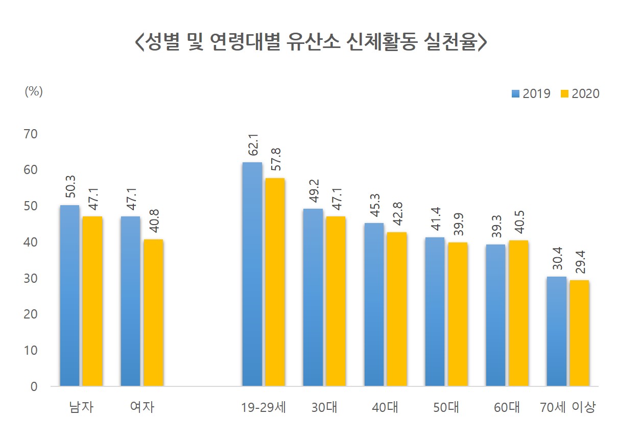 질병관리청 「국민건강영양조사」 통계자료 위 왼쪽 그래프는 ‘성 및 연령대별 유산소 신체활동 실천율’을, 오른쪽은 ‘성 및 연령대별 비만 유병률’을 나타내고 있습니다. 2020년 우리나라 19세 이상 성인의 유산소 신체활동 실천율은 44%로 전년보다 1.6% 감소했지만 비만 유병률은 38.4%로 전년보다 4% 증가했습니다. 유산소 신체 활동 실천율은 남성이 여성보다 큰 폭으로 감소했으며 60대를 제외한 모든 연령대에서 감소했습니다.