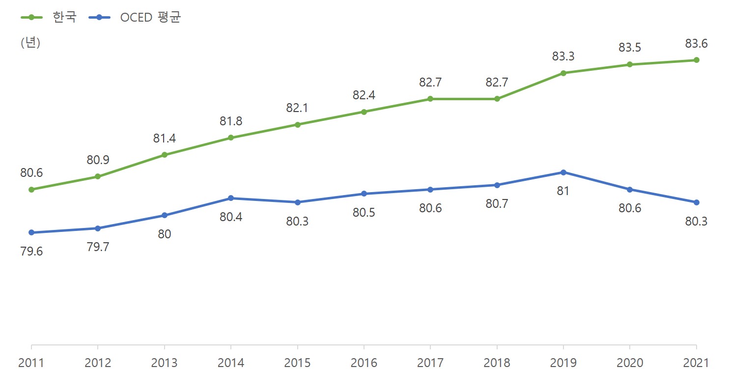 기대수명 추이 (2011~2021년), 보건복지부 통계자료 위 표를 보면 2021년 기준 한국인의 기대수명은 83.6년으로 OECD 국가 평균인 80.3년보다 3.3년 깁니다. OECD 국가 중 기대수명이 가장 긴 일본 84.5년과도 0.9년 밖에 차이가 안 나요. 10년 전과 비교하면 3년이나 증가했죠. 이렇게 기대수면은 점점 증가하고 있습니다.