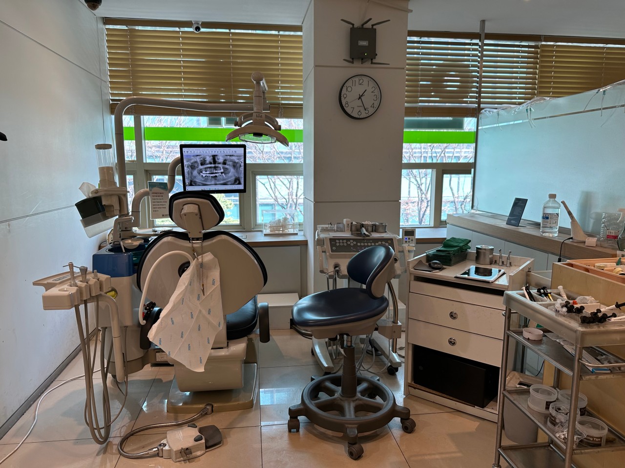 저는 최대한 심플하게 하려고 했습니다. 처음 인테리어를 하려고 했을 당시, 애플의 아이맥(iMac)이 너무 예뻤습니다. 그래서 저는 병원에 아이맥(iMac)으로 다 설치해서 그 아이맥에 어울리는 인테리어를 하고 싶었어요. 하지만 치과에서 쓰는 모든 보험 청구 프로그램 등이 아이맥(iMac)과 호환이 안 되는 것이었습니다. 그 다음부터 이렇게 못생긴 데스크탑이 오면서 원하는 인테리어를 하지 못하게 된 것이죠.