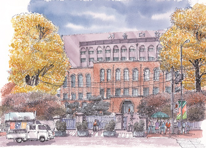대한의원 본관 길 건너에는 서울대학교 의과대학이 혜화역 3번 출구에 가까이 있는데 아침마다 출근길로 분주하다. 가을 햇볕을 피해 보도에 설치한 파라솔이 정겹고, 왕래하는 인파를 붙잡는 다양한 상품들이 흥미롭다. 샛노랗게 만추를 맞이한 은행고목은 갈색 타일로 마감된 건물의 외벽색상과 묘한 조화를 이루고 있다. 서울대 병원 본관 앞에 있는 대한의원 본관(사적 제248호)은 1908년 대한제국 내부의 서양식 병원으로 설립되었으며 우리나라 최초의 서양식 국립병원인 제중원의 맥을 잇고 있다. 중앙의 시계탑을 중심으로 좌우대칭의 고전적 비례로 바로크 건축의 의장적 요소를 지니고 있는데 현재는 의학박물관으로 활용되고 있다. 단정하게 지어진 붉은 벽돌은 서울대병원 캠퍼스 내에서 레트로한 존재감을 갖는다.
