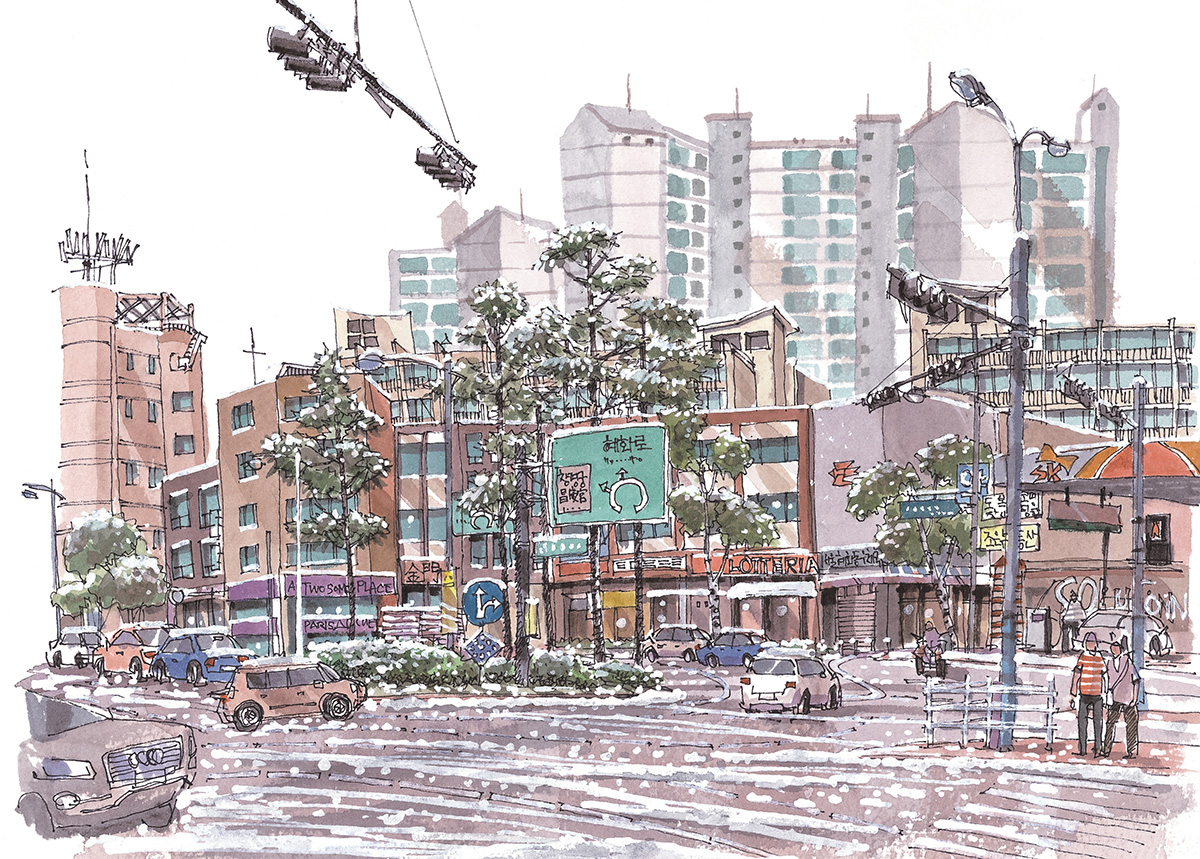 대학로 JS빌딩 대학로 JS빌딩은 건축가 조건영의 작품으로 당시 그는 철과 유리, 콘크리트같은 현대적인 건축 재료를 활용하여 기하학적인 이미지로 붉은 벽돌의 대학로 거리에 신선함을 추구했다. 혜화역 1번 출구로 나오면 오래된 갈비집, ‘낙산가든’과 이웃하고 있었는데 최근에 가보니 이미 헐리고 다른 새 건물이 생경하게 들어서있다. 그림으로 기록해 두길 잘했다는 생각이 든다.