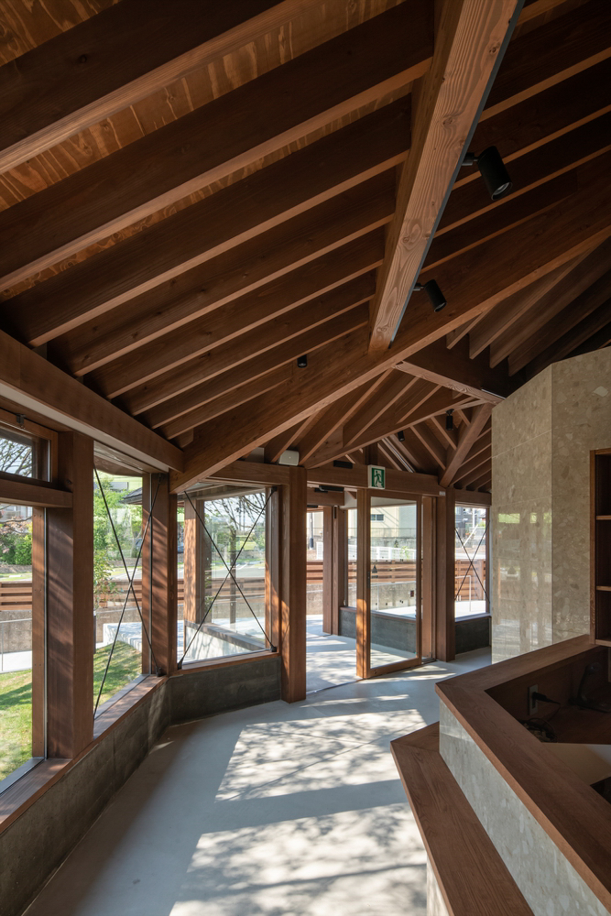 산책로를 걷듯 자연을 경험할 수 있는 치과를 디자인하기 위해 먼저, 가능한 한 많은 식물을 보존하면서 건설할 건물의 범위를 결정했다. 다음으로, 대지 특성에 잘 맞도록 치과의 기능을 배치했다. 그런 다음 대지 전체에 여러 건물을 흩뿌리는 방법을 찾았다. 그 후, 흩뿌린 건물을 단일 도로와 여러 개의 지붕으로 연결했다.