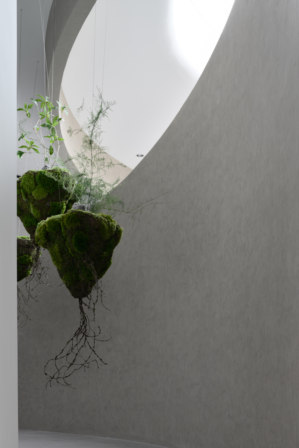벽은 공간 전체에 걸쳐 동적이고 우아한 분위기를 자아낸다. 유선형의 벽은 주변 전시물 그리고 장식과 조화를 이루는 동시에 그들만의 독특한 매력을 보여주며 시적인 아름다움을 제공한다. 교차하는 벽과 원형 천장은 Kabel 마이크로시멘트, 마이크로크리스탈 시멘트, 밀란 벨벳, 그리고 Breya와 같은 물감으로 장식되어 있다.