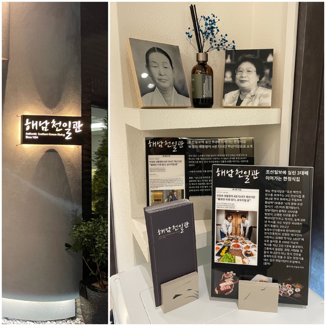 지난 주 지인들과 함께 찾은 식당은 반포동 뒷골목에 자리 잡은 백 년 노포 ‘해남 천일관’이다. 입구 탁자 위에 진열한 흑백 사진들로 3대째 한식 요리의 노하우를 이어오고 있는 식당임을 자랑하고 있다. ‘좋은 맛은 좋은 식재료에서 나온다’는 말이 있듯 메뉴판에 원산지가 대부분 남도의 신선한 식재료를 사용했다고 명기되어 있다.