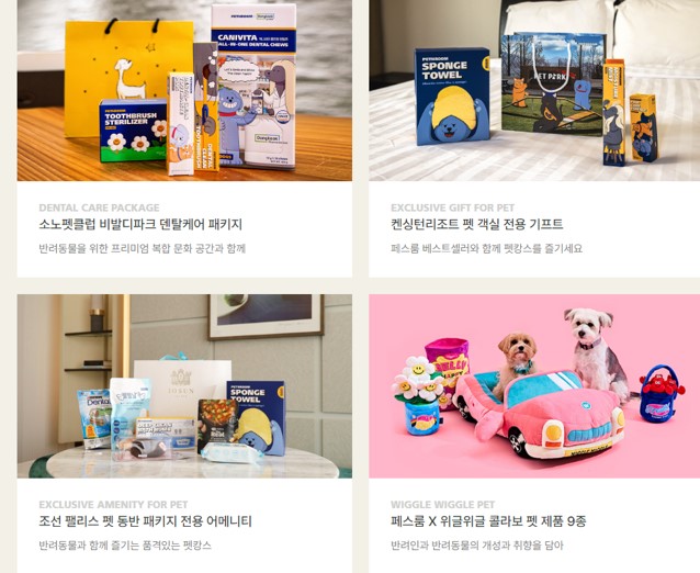 (이미지: 페스룸 공식 사이트) 더불어, ‘동원’ · ‘대한항공’ · ‘위글위글’ 등 산업을 주도하는 주역들과의 상생을 통해 브랜드 홍보에 힘쓰며 브랜드 가치를 향상시키고 있다. 페스룸은 '룸메이트' 캐릭터 패키지를 활용해 반려동물과 사람에게 유용한 여러 굿즈를 제작하기도 하였으며, 반려인이 안심할 수 있도록 사람 또한 먹을 수 있는 질 좋은 휴먼 그레이드 식품을 개발하여 판매 중이다.
