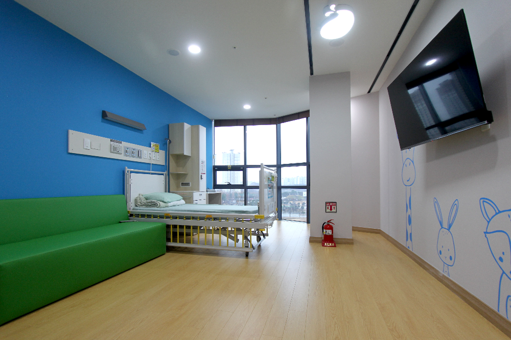 바닥은 온돌 시스템이 가동되어아이들이 따뜻한 바닥에서 즐겁게 뛰어놀 수 있게 적용한 점이 돋보인다. 또한 4인실은 오렌지 컬러로, 1인실과 2인실은 짙은 블루 컬러로 화사한 컬러감을 한쪽 벽면에 입혀내어 분위기를 달리했다.