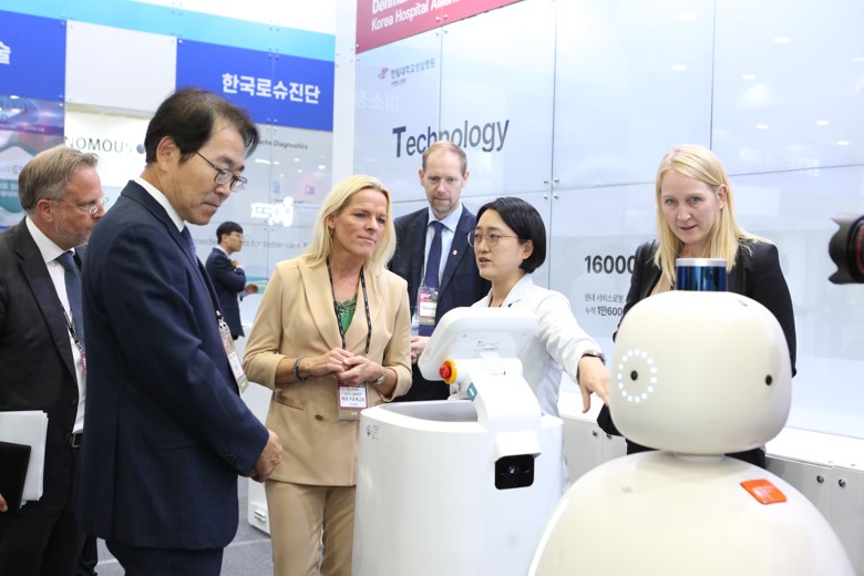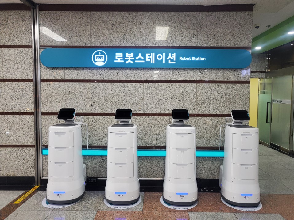 우리 병원은 국내에서 유일하게 6종 로봇 72대가 돌아다닙니다. 삼성병원을 비롯한 몇몇 대형병원에서는 야간에 정해진 길을 따라 돌아다니는 배송 로봇이 있습니다. 우리 병원 로봇의 특징은 몸통 부분에 디스플레이가 설치되어 안내문이 나오고 눈도 깜빡깜빡 움직이면서 지나가는 환자들에게 말도 하고 사진도 찍습니다. 그리고 엘리베이터를 혼자 탈 때 환자가 타려고 하면 “먼저 타세요”라고 말하고 기다렸다가 타거나, 사람이 많아서 못 내리면 “다음에 내릴게요”하고 기다렸다가 내립니다. 그런 시나리오가 들어가 있는 것이죠. 얼마 전에는 우리 병원 로봇을 보려고 덴마크 보건복지부와 고령부장관이 직접 방문하기도 했었습니다.