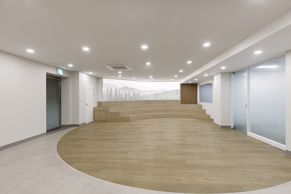 지하 1층 라운지 공간 지하 1층의 사무공간은 대회의실과 라운지 공간이 광장의 분위기처럼 편안하게 디자인됐다. 특히 자연채광이 없는 공간의 답답함을 해소하고자 디지털월을 활용한 점이 돋보인다. 넓게 형성된 디지털월에는 자연의 모습을 계속해서 보여줌으로써 마치 자연 속에 들어와 있는 듯한 착각을 불러일으키기에 충분했다. 또한 앞에는 라운드형의 계단식 의자를 설치해 그곳에서 직원들이 자유로운 분위기 속에서 회의하거나 차 한 잔을 즐길 수 있다. 광장의 컨셉으로 연출된 이곳은 바닥까지 우드의 질감을 활용한 내추럴한 분위기를 물씬 풍겨냈다.