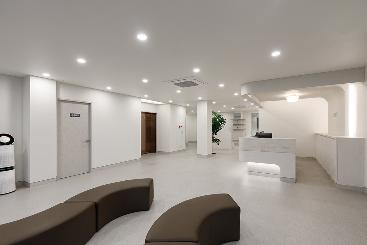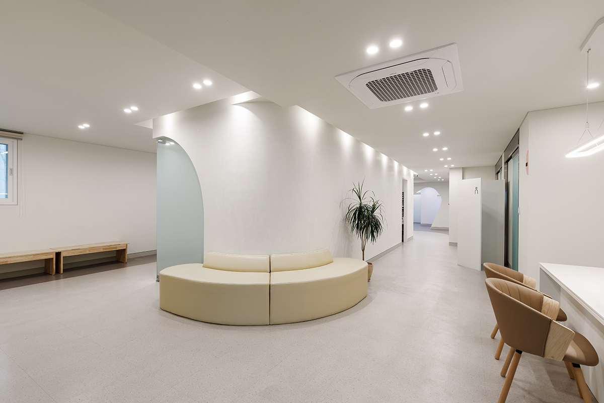 안내데스크와 마주한 곳은 기초검사실이다. 기초검사실은 안내데스크 및 대기공간과의 자연스러운 분리감을 주고자 비정형의 라인으로 독특하게 연출했다. 비정형의 라인은 파티션처럼 한쪽만 오픈되어 있어 개방감과 프라이버시를 동시에 만족시키기에 충분했다. 또한 이는 안내데스크의 유선형 라인과 일체감을 이루며 유기적으로 연결되어 있다.