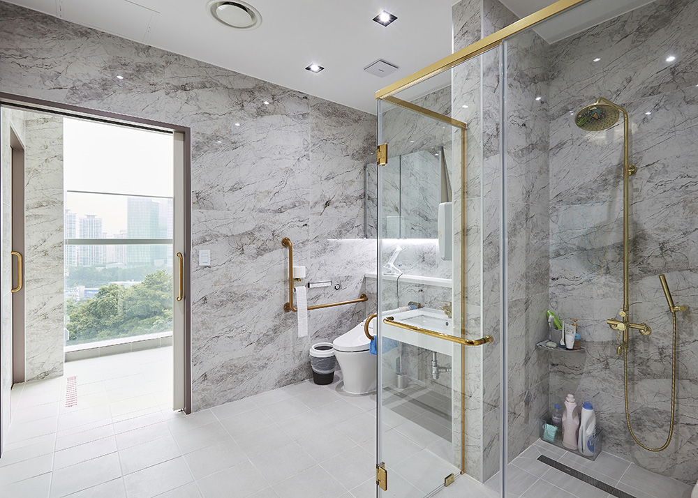 두번째 욕실은 전체 대리석 타일과 골드 컬러의 수전 및 샤워 부스, 안전봉으로 고급스러움과 세련미를 겸비한 디자인이 돋보인다. 이곳 역시 환자의 휠체어 이동을 고려한 넓고 위생적이며 안전한 디자인을 추구했다. 특히 샤워부스 외에 별도로 마련된 욕조 공간이 눈에 띈다. 별도로 마련된 공간에는 넓은 창가뷰가 조성되어 있어 환자전용 욕조에서 창가를 바라보며 샤워할 수 있는 것이 장점이다. 그만큼 이곳 역시 유니버설 디자인이 적절하게 적용된 환자 중심 공간으로 조성되었다.