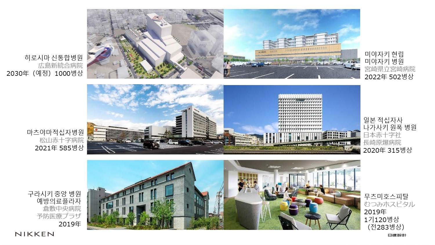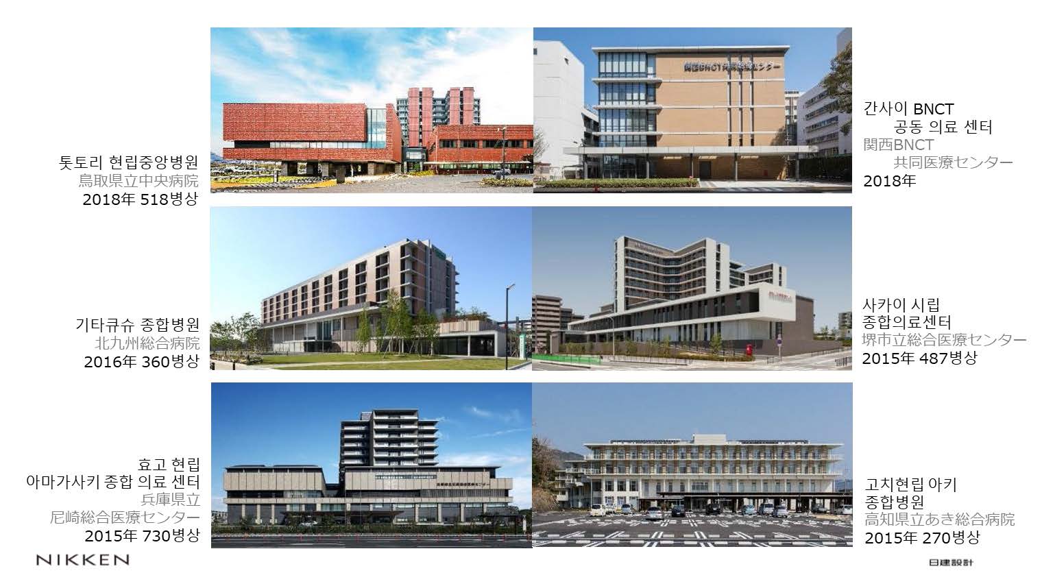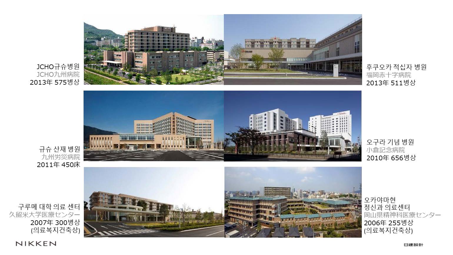 그중 주요 프로젝트를 소개하면, 올해 봄부터 설계에 들어갈 히로시마현의 3개 병원을 통합한 병원이다. 이곳은 1천 병상 정도가 되는데, 일본 병원이 일반적으로 300병상이나 500병상 정도의 규모인 데 반해, 아주 큰 규모의 병원이라 할 수 있다. 또한 국제적인 그린 호스피탈상을 수상한 마츠야마 적십자병원을 포함해, 암을 치료하는 간사이 BNCT 공동의료센터, 전실이 개인실로 구성된 기타큐슈 종합병원, 그 이외에 제이코나 적십자병원, 산재병원, 오쿠라 기념병원 등이 대표적이다. 또한 오카야마현에 있는 정신과 의료센터를 시작으로 몇 개의 정신과 병원도 담당했다.