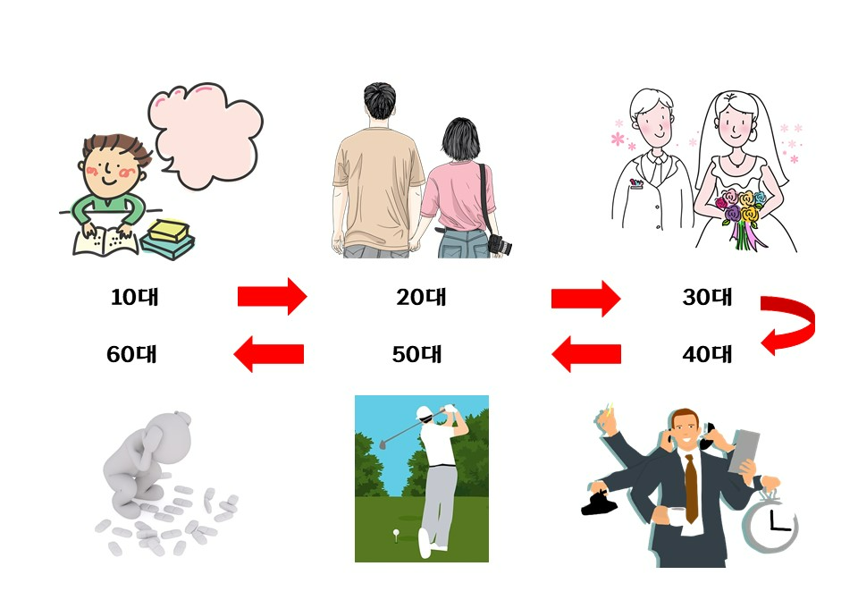 10~20대는 공부에 집중해야 할 나이입니다. 더러 만학을 했다는 얘기도 들리지만 젊어서 해야 할 공부를 나이 들어서 하는 일은 결코 쉽지 않죠. 중고등학생들은 버스 정거장에서나 지하철 안에서도 문제집을 풀고 있는 모습을 자주 볼 수 있습니다. 나이 든 사람들에게서는 그런 모습을 거의 볼 수 없죠. 길거리에서 맨손으로 골프채를 휘두르는 모습을 연출하는 사람은 있지만. 그렇게 공부는 어린 나이에 해야 하는 겁니다. 또 20대는 이성에 관심을 가질 나이죠. 30~40대에는 가정을 이루고 직장/사업을 열심히 해 돈을 착실히 벌어야 합니다. 세상에서 제일 힘든 일이 돈을 벌고 모으는 일인 것 같아요. 더구나 큰 부자가 되기는 더 어려운 일이죠. 그만큼 재산 형성은 체력도 왕성하고 두뇌 회전도 빠른 젊은 나이에 하는 것이 좋습니다. 과거에는 50대에 소득이 제일 많았지만 요즘 50대는 퇴직 후 어떤 일을 할 것인지 준비를 해야 하는 시기죠. 대부분 그 나이를 전후해 퇴직하기 때문입니다. 퇴직 후 50년을 어떻게 살 것인지 미리 고민하고 준비해야 합니다. 60대부터는 건강관리에 부단히 신경을 써야 할 나이입니다. 그래야 100살까지 건강하게 살 수 있기 때문이죠. 70대 이후에는 후손들에게 어떤 유산을 물려줄 것인지 고민해야 할 나이입니다.