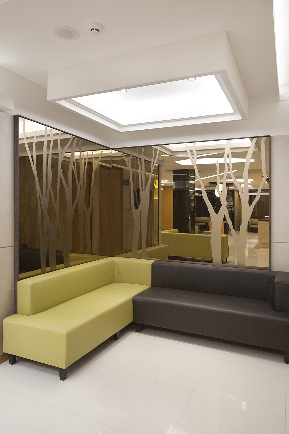 병원은 전체적으로 따뜻하고 아늑한 베이지 톤의 대리석 타일로 고급스러움을 강조했습니다. 특히 전체 유광의 폴리싱 타일을 적용해 광택감이 더해져 벽과 바닥이 한층 빛납니다. 여기에 접수대 뒤쪽 벽면에는 옐로우 빛의 간접 조명으로 인해 더욱 밝고 화사한 느낌을 전달합니다. 중간중간 설치된 기둥 역시 흑경을 적용해 강인하고 단단한 이미지를 심어주었으며, 우물천정 안에는 브라운경으로 바닥을 비춰 공간의 확장감을 더해주었습니다. 둥근 형태의 디자인 조명은 브라운경에 비춰 시각적인 풍성함을 더해주고 있습니다.