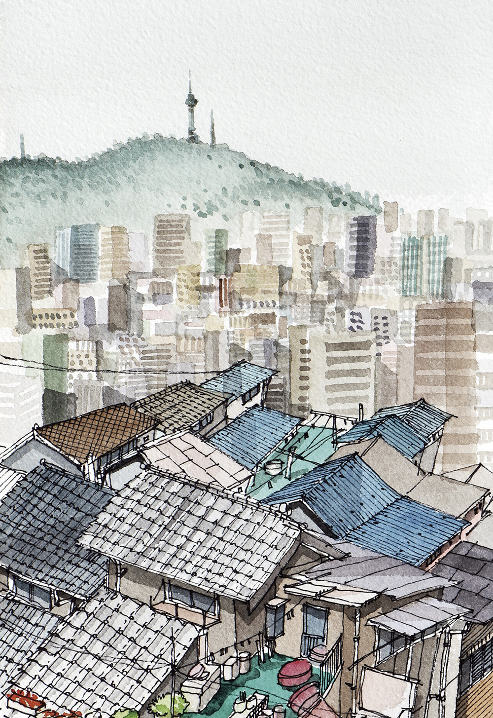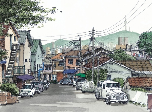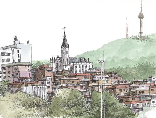해방촌은 남산 첫 마을이다. 해방과 더불어 한국전쟁의 실향민과 이주민이 서울역과 가까운 남산을 임시거처로 활용하며 시작된 서민마을이다. 하지만 2000년 중반부터 편리한 젊은 문화예술인들과 외국인들까지 모여들어 서울을 대표하는 문화예술 일번지로 자리 잡고 있다. 복잡하고 분주한 골목길 안의 일상과 남산타워가 공존하고 있다. 해방촌 언덕 위에 자리 잡은 해방촌교회의 십자가 종탑은 멀리 서울타워와 교신 중인 듯 그림 안에서 병치된다.