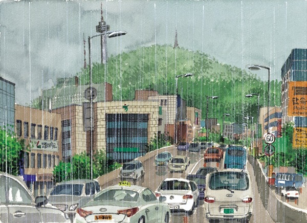 한남대교를 건너와서 장충동 방향 고가도로를 앞두고 소나기를 만났다. 게릴라성 호우 때문인지 차량정체가 심하지만 차 지붕을 두드리는 빗소리는 자연이 연주하는 교향악쯤으로 여기고 여유를 즐긴다. 이렇게 빗속의 남산을 바라보며 잠시 상상 속에서 주파수가 다른 세계의 여행도 흥미롭다.