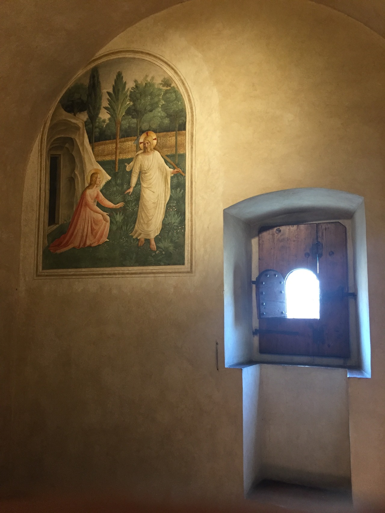 첫 번째 방에는 부활한 예수를 처음 발견한 막달라 마리아가 손을 잡으려 하자 예수가 “나를 잡지 마라”라고 말하는 장면이 있다. 복도에 있는 ‘수태고지’ 다음으로 감동을 받은 작품이다. 왜 이 그림을 첫 번째 방에 그렸을지 궁금하다. 우선 예수는 영혼만 부활한 것이 아니라 육체까지 부활했다는 것을 강조하고 있다. 프라 안젤리코는 다른 수도사들에게 바로 그 믿음이 가장 중요하며, 그 믿음을 가지고 신앙생활을 하기를 바랐을 것이라고 생각한다.