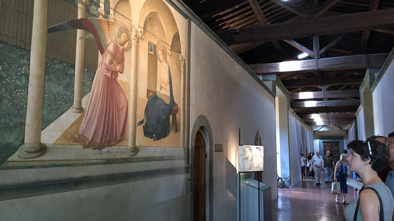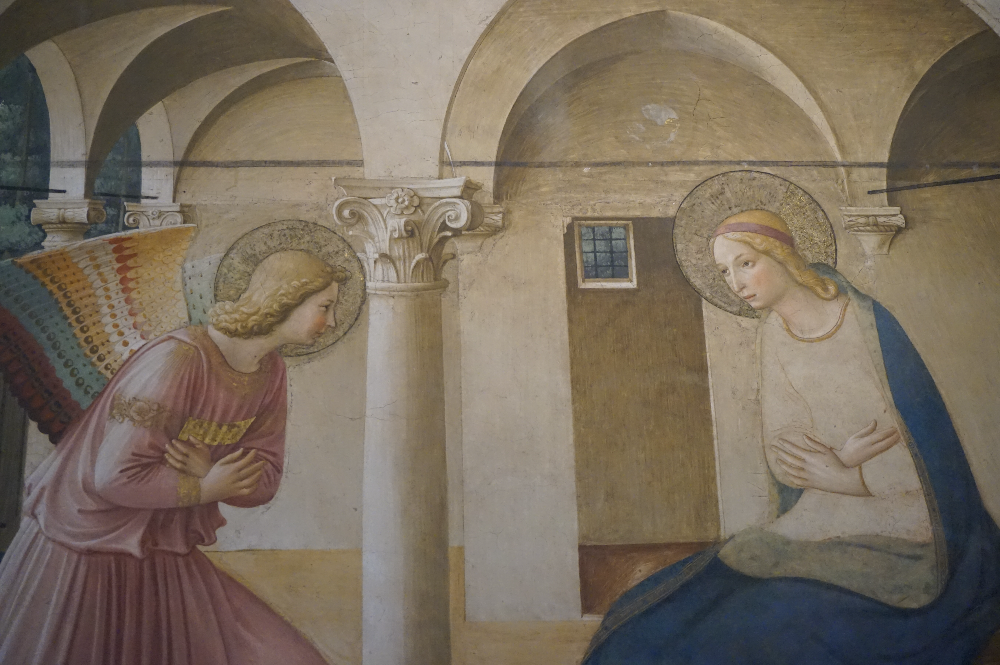산마르코 광장에 있는 성당을 바라보면서 왼쪽에 수도원으로 들어가는 입구가 있다. 소박한 입구를 통해 안으로 들어가면 넓은 내부 정원을 둘러싸고 아치들이 이어지는 산 안토니오 회랑이 눈에 들어온다. 회랑을 따라 가면 2층으로 올라가는 계단이 나온다. 계단을 올라 첼라(Cella)라고 하는 수사들의 독방이 줄지어 있는 2층에 도착해 고개를 든 순간 마주하게 되는 벽면에 ‘수태고지’가 그려져 있다. 심장이 ‘쿵’ 하고 멎는 느낌이다. 작품을 보는 순간 온몸이 그 자리에서 얼어붙는 것 같았다.