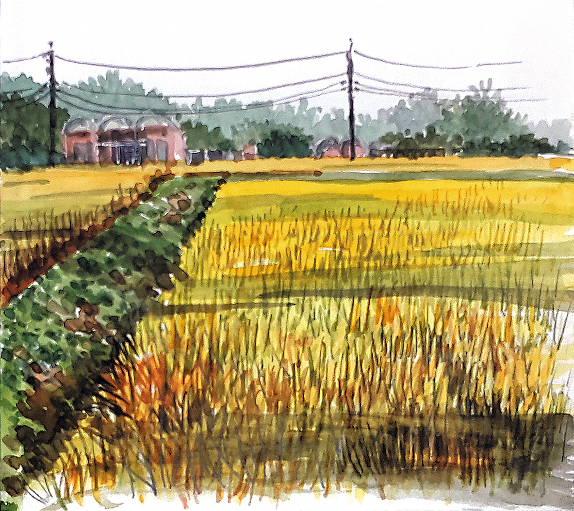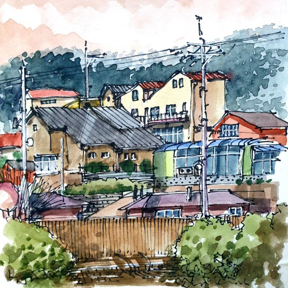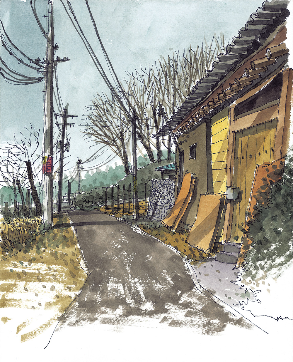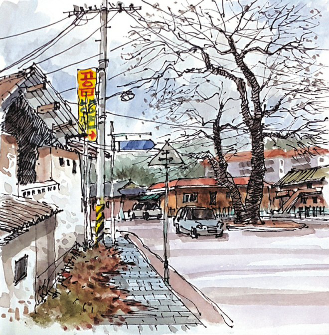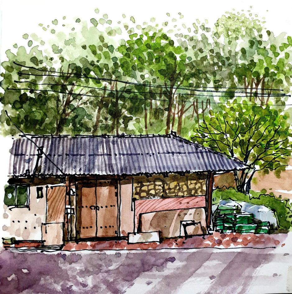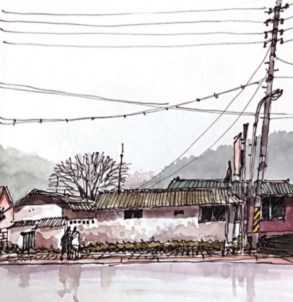 양평 옥천 양평 못미쳐 옥천이라는 마을이 있다. 이 마을은 냉면으로 유명한 곳이라 냉면의 덕후들은 서울에서 차를 몰고 이 곳까지 와서 냉면을 즐기고 갈 정도다. 마을 중간에 빈티지한 집이 눈에 들어와 스케치북에 담고 싶어졌다. 주변에 오래된 느티나무 한 그루와 기울어진 담벼락, 전봇대와 간판, 잡초가 자라나는 기와지붕, 빛바랜 툇마루, 녹이 슨 선홈통과 굴뚝 등, 일반인들에게는 지저분하게 보일 수도 있지만, 나의 시선과 발길을 붙잡는다. 소외된 아름다움들이 모여 레트로 감성으로 어우러져 있다. 세월의 풍상을 겪으며 오늘까지 왔으니 내 눈에는 참 대견하고 예쁘다. 인위적으로는 절대 만들기 어려운 멋스러움이다. 냉면을 먹고 오랜만에 길 위에서 얻은 큰 수확이다. 저 집이 아직 남아있을까 궁금하다.
