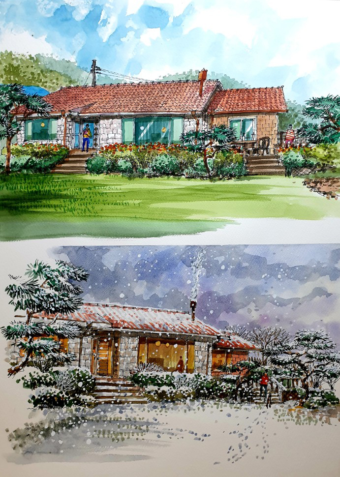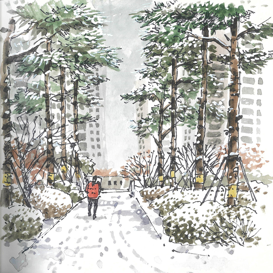 아파트 거주는 전형적인 도시형 라이프라서 자연으로부터 연유된 건강한 삶의 패러다임과 공존하기는 매우 어렵다. 여러 세대가 함께 사용하는 공동 주거는 대개 건조하고 천편일률적인 거주 공간이라서 창의적이고 개성적인 공간 활용이 어렵다. 하지만 그나마 내가 살고 있는 곳은 한적한 경기지역이고 넓은 단지에 조경시설이 잘 조성된 편이어서 위안을 삼는다. 주변을 산책하면서 감성적인 아파트 풍경을 드로잉북에 기록하곤 한다.