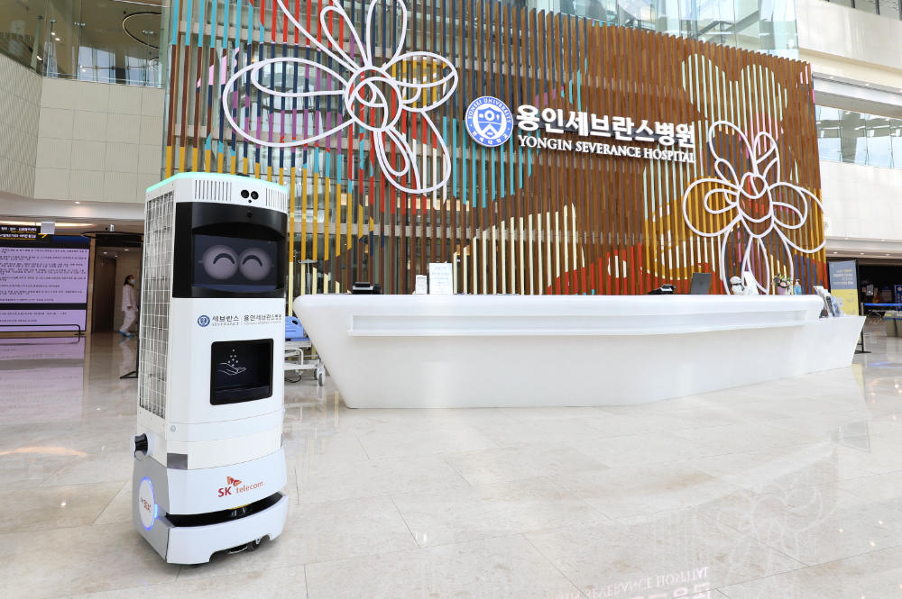 용인세브란스병원 5G 방역로봇 비누(BINU) 특히 2021년 4월에 스마트병원 선도모델 사업으로 SK텔레콤과의 협업을 통해 세계 최초 5G 네트워크와 실시간 위치 추적 시스템(RTLS) 감염관리 솔루션을 활용한 복합 방역로봇 ‘비누(BINU)’를 도입해 운영 중이며, 현재 총 11대의 의료서비스로봇을 성공적으로 운용하고 있습니다.