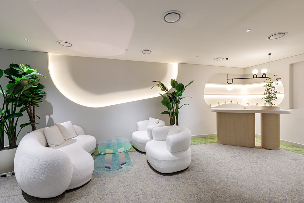 이번 보건산업진흥원 오피스는 인포데스크부터 곡선형의 라운드 소파와 디자인으로 공간을 부드럽게 감싸고 있는 점이 돋보인다. 편안하고 아늑한 공간을 지향하는 ‘컴포트코어 인테리어(Comfortcore Interior)’가 서울리빙디자인페어에서 올해 홈 트렌드로 제안한 만큼, 곡선형의 가구와 디자인으로 오피스를 가득 채웠다. 전체 아이보리 컬러를 베이스로 한 인포데스크는 벽을 하나의 오브제처럼 곡선으로 포인트를 주고 그 안에 간접조명을 심어 은은하면서도 안락한 분위기를 더해주고 있다. 특히 곡선 라인 안에는 선반을 설치해 수납공간으로도 활용하게 한 점이 눈에 띈다. 그 앞에 놓여있는 소파와 테이블도 곡선으로 이루어져 있다. 일명 ‘구름 소파’나 ‘뚱뚱한 소파’로 불리워지고 있는 소파는 이름처럼 푹신하게 디자인되어, 앉았을 때 더없는 편안함이 느껴진다.