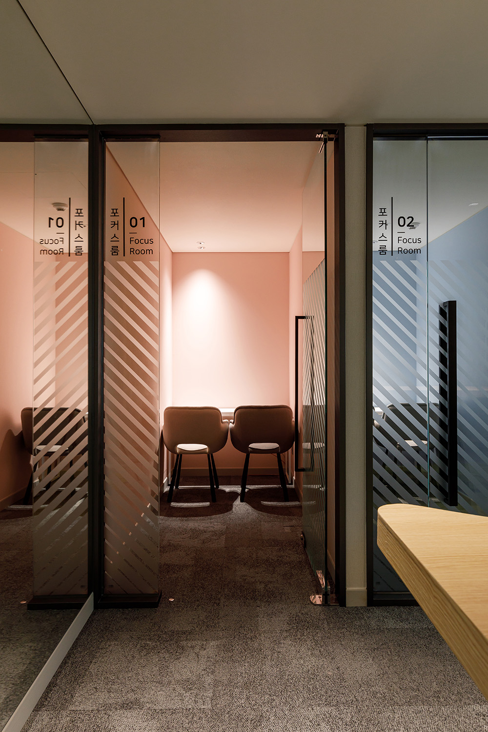포커스룸 중회의실은 전체 화이트 컬러의 벽 마감과 테이블로 아늑하게 디자인되었으며, 소회의실은 짙은 블루 컬러의 벽 마감을 적용, 오렌지 컬러의 체어와 조명이 포인트 있게 연출되어 감각적인 분위기를 선사한다. 추진단장실의 경우 블랙 컬러의 가구 마감으로 시크한 분위기가 느껴진다. 포커스룸은 블루와 핑크, 아이보리 컬러로 각각 디자인되어 파스텔톤의 신선한 분위기 속에서 1인 혹은 2인이 개별적으로 일하거나 스터디룸으로 활용될 수 있게 꾸며졌다. 이들 공간은 모두 대회의실 외에 개방감 있는 통유리벽으로 내부 공간을 은은하게 투영하고 있다. 그만큼 이번 프로젝트는 MZ세대부터 모든 세대가 자유롭게 이용할 수 있도록 각기 다른 스타일과 디자인이 접목된 미래지향적인 사무공간으로 손색이 없다.