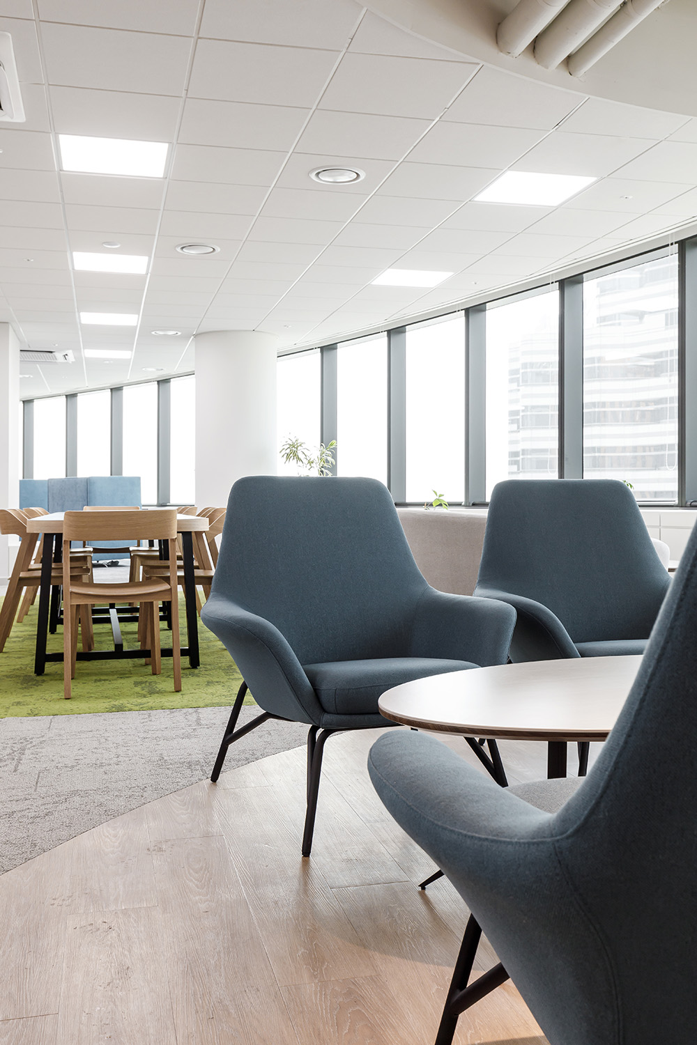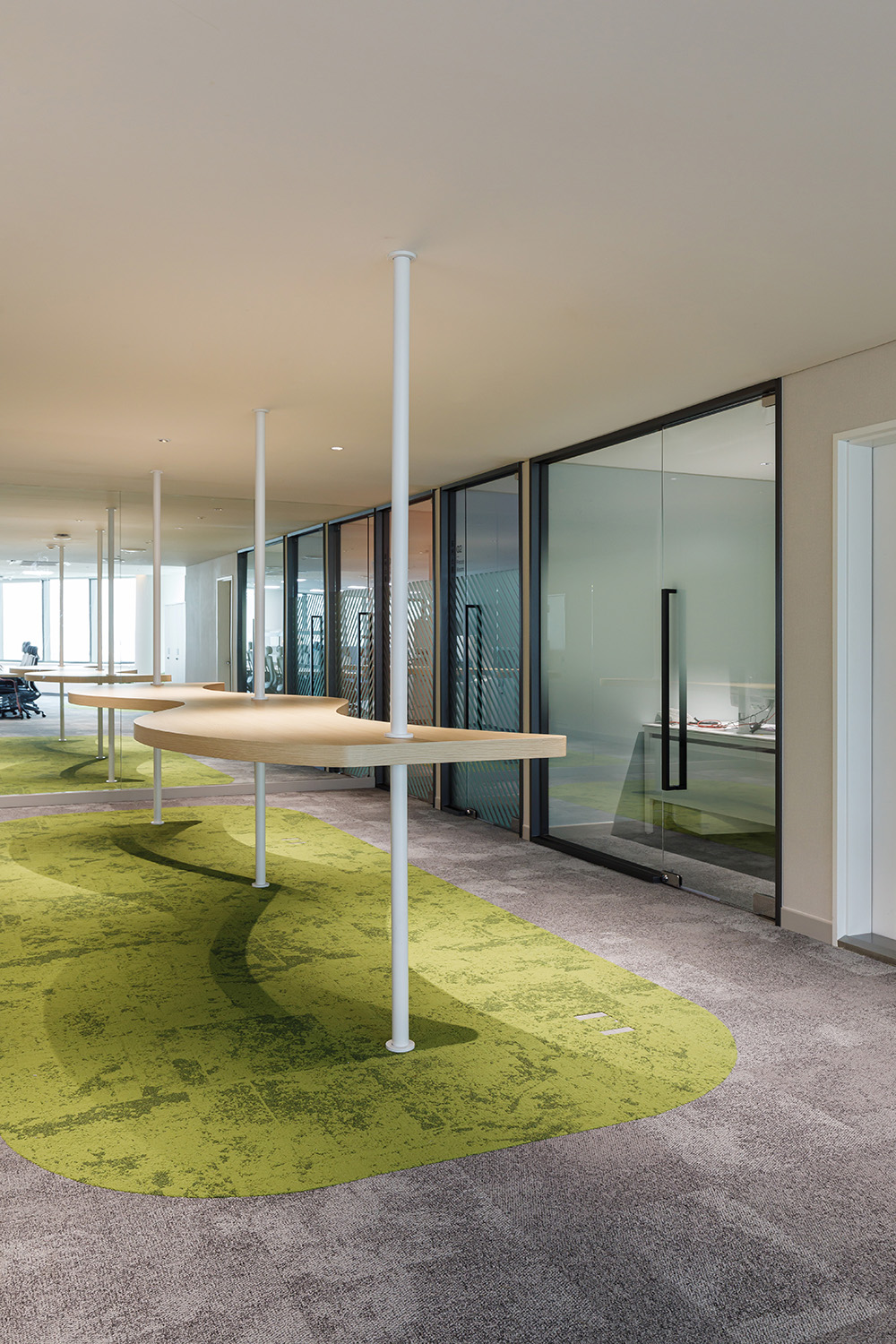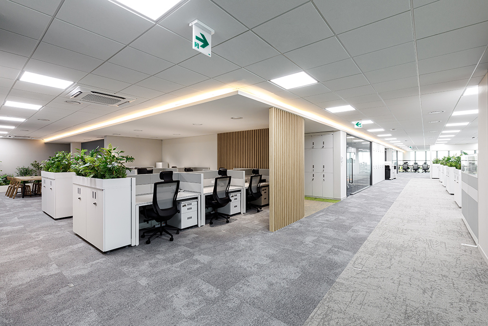 그린 컬러로 포인트를 준 바닥 한 가지 눈에 띄는 부분은 바닥이 카펫타일로 마감된 점이다. 카펫타일의 가장 큰 장점은, 소음을 감소시켜 주고 바닥의 차가운 기운을 막아주며 온도를 따뜻하게 유지해 주는 보온기능이다. 이는 오피스 공간에서 가장 필요한 부분이라 할 수 있다. 또한 미끄러움을 방지하여 안전하다는 점이다. 더욱이 별도의 시공이 필요하지 않아 비교적 간단하고 청소도 쉬어 유지보수나 관리가 용이하다. 이번 보건산업진흥원 오피스에 설치된 카펫타일은 이러한 요소가 장점으로 부각되고 있으며, 전체 그레이 컬러를 베이스로 한 바닥 곳곳에 그린 컬러로 포인트를 줌으로써 내추럴한 자연의 분위기를 가미시켰다. 카펫타일을 통한 컬러의 변주는 녹색 환경을 더욱 돋보이게 하며, 푹신하고 포근한 자연의 이미지를 오롯이 대변하고 있다.