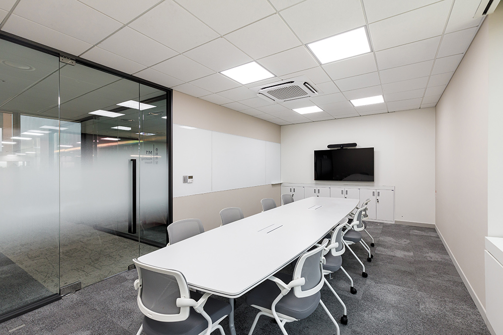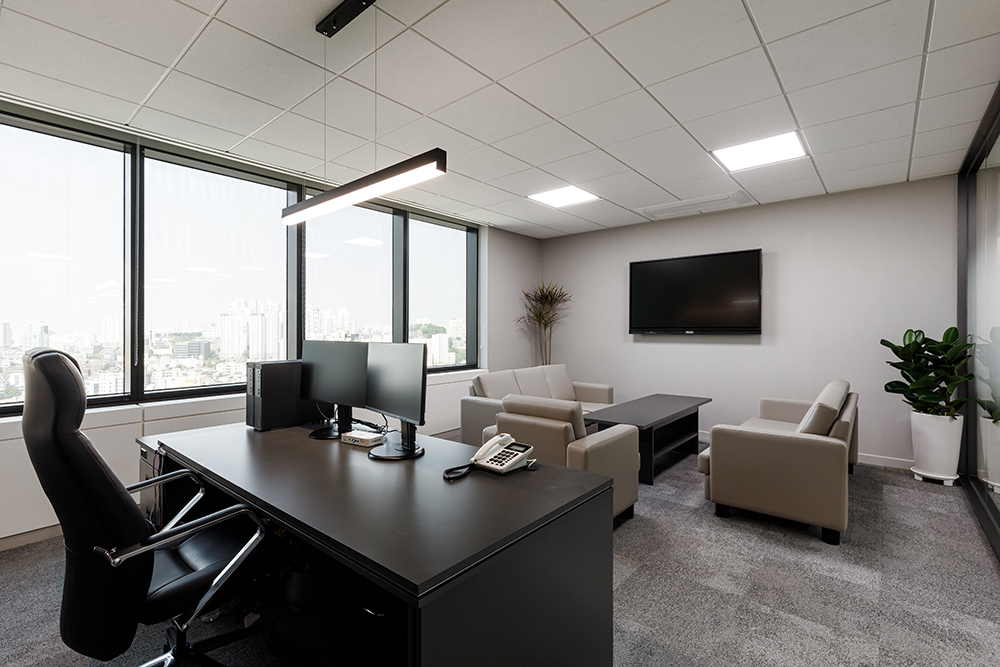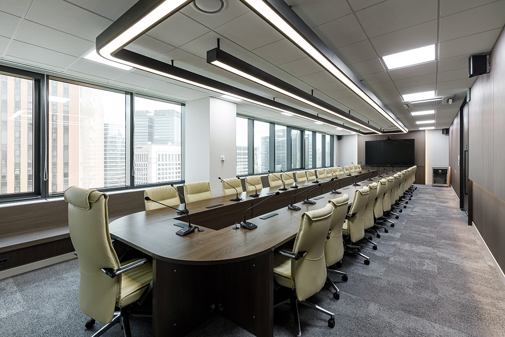 이번 보건산업진흥원 오피스는 상시근무자와 임시근무자를 포함해 총 80명 정도가 유동적으로 근무하며, 그 모든 인원을 수용할 수 있을 만큼 쾌적한 환경을 자랑한다. 특히 30여 명 이상의 국제회의가 가능한 대회의실과 1~2인 포커스룸을 포함한 중소회의실이 5~6개 정도로 구성되었으며, 서로 부딪히지 않게 동선을 계획하여 모든 공간이 폭넓고 짜임새 있게 디자인됐다. 국제회의실의 경우 넓은 통창으로 인한 자연채광이 안쪽 깊숙이 들어와 회의하기에 가장 적합한 밝고 환한 분위기를 조성한다. 또한 전체 짙은 우드톤으로 중후하면서도 클래식한 느낌을 물씬 풍겨낸다.