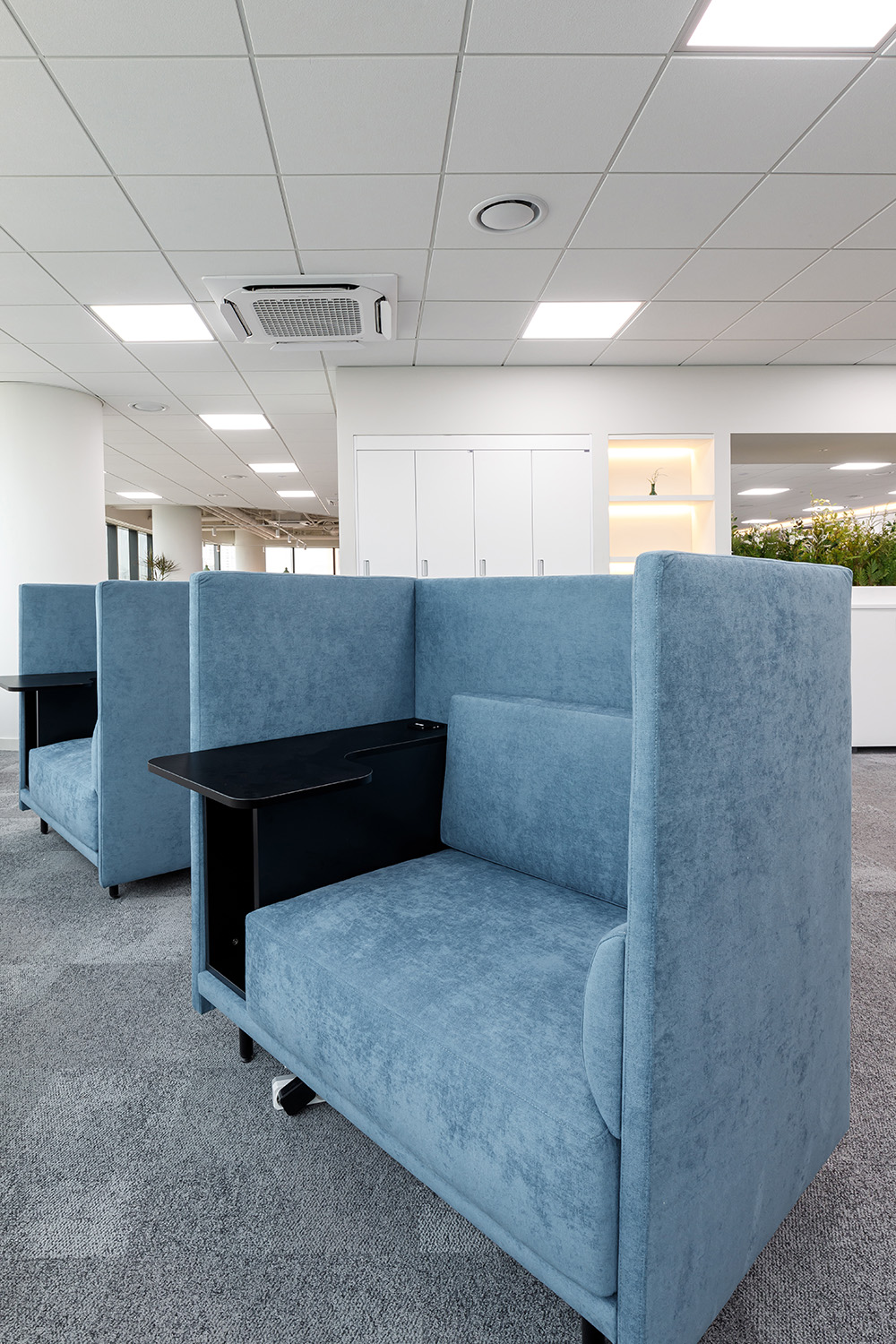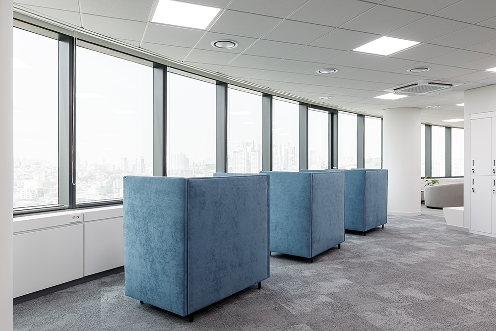 또한 PM공간에 적용된 블루 컬러의 1인용 높은 등받이 체어 역시 푹신함을 자랑한다. 디자이너는 오피스에서 개인별로 유연한 라운지 공간의 필요성을 제기했다. 이에 개인의 프라이버시가 가능한 1인용 체어를 마련한 점이 돋보인다. 1인용 체어는 몰입과 소통이 가능하도록 등받이가 높게 설정되어 있어 일의 능률을 향상시켜 줄 것으로 기대된다. 그만큼 이번 보건산업진흥원에 사용된 소파나 의자들은 모두 푹신한 디자인을 적용한 점이 특징이다. 편안한 쿠션감이 느껴지는 디자인으로 공간마저 편안하게 물들이는 연출은 보건산업진흥원 오피스의 대표적인 키 포인트다.