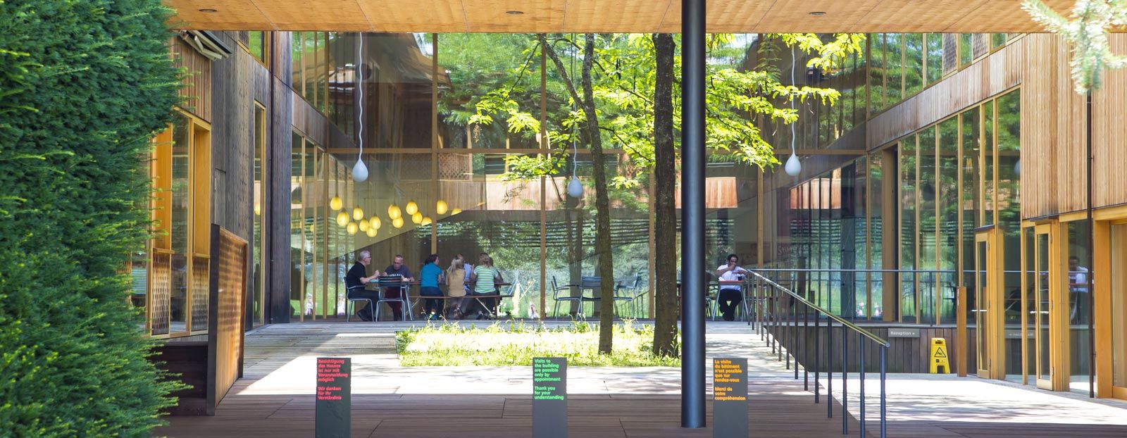 REHAB, Clinic for Neurorehabilitation and Paraplegiology Basel, Switzerland 먼저 스위스에 있는 재활병원인 ‘REHAB, Clinic for Neurorehabilitation and Paraplegiology Basel, Switzerland’의 경우, 병실은 전부 고층이 아닌 저층에 위치해 있다. 2층짜리 병실이고, 2층의 평면은 병실이기 때문에 어쩔 수 없이 외주부에 병실을 놓을 수밖에 없었다. 또한 네모난 박스 형태의 2층짜리 건물 내부 공간은, 창문이 없는 실들로 구성될 수밖에 없는 상황에서 다양한 형태의 중정과 정원들을 안으로 끌어들여 환자나 의료진들에게 자연을 경험할 수 있도록 계획되었다. 병원 전체에 사용된 재료는 녹색지붕, 단열재, 골판 아크릴 시트, 목재 피복재, 콘크리트 슬래브, 나무데크, 플렉시 유리, 나무발 순으로 되어 있는데, 여기서 플렉시 유리는 나무발 사이에 끼워져 있어 열을 흡수하는 역할과 어두울 때 빛을 내는 효과를 발휘한다. 나무발은 열을 흡수하면서 병실을 둘러싸고 있어 시각적인 차단 효과까지 담당하고 있다.