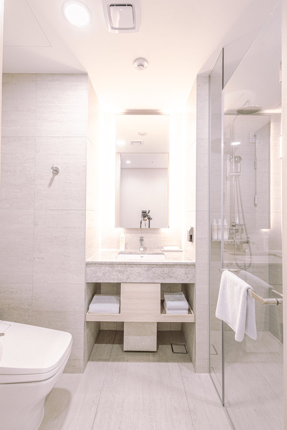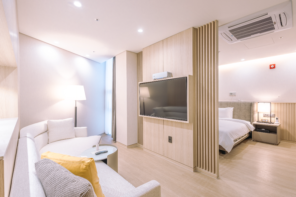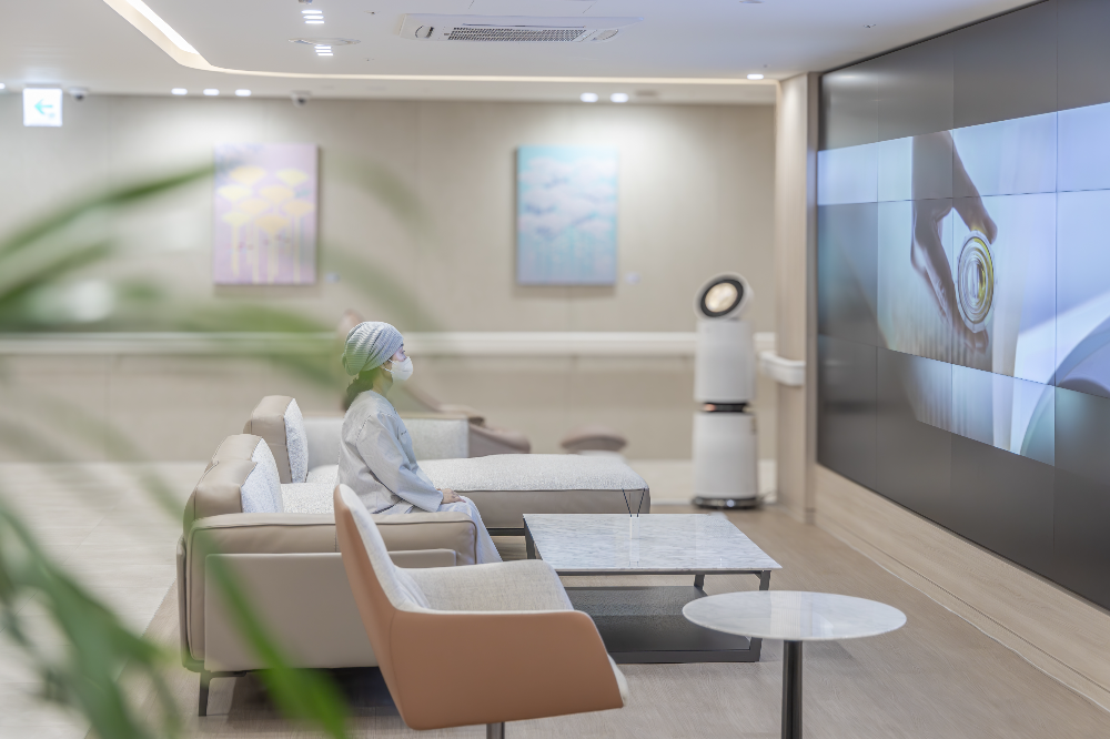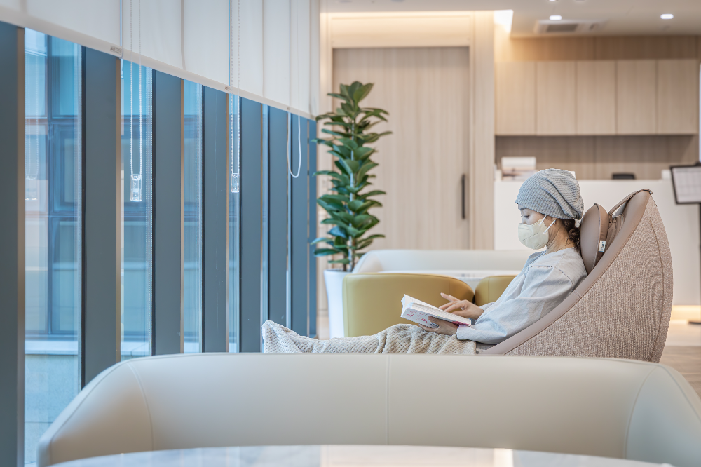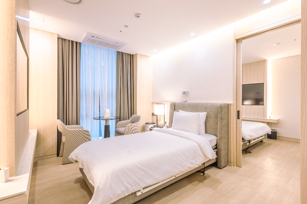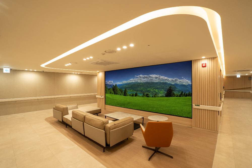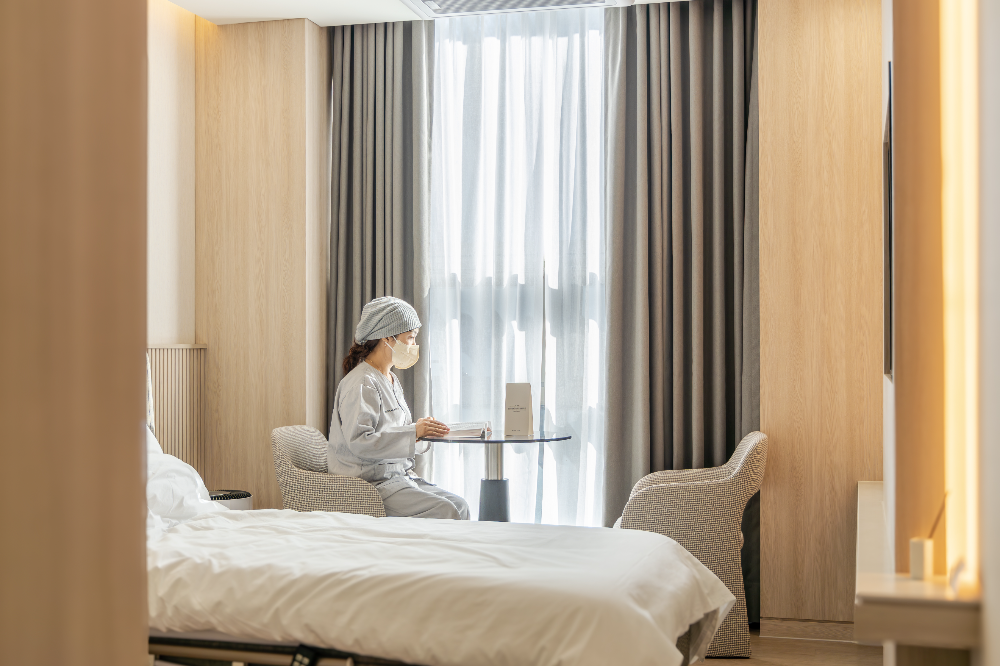 포레스트라인룸 전체 병실로 이루어진 4층의 경우, 호텔처럼 프라이빗하게 형성되었다. 이곳은 시티뷰 룸과 포레스트 라인 룸으로 분리되었는데, 시티뷰 룸의 경우 창문이 작은 게 특징이다. 대체로 암 환자의 경우 불면증으로 고통받는 이들이 많기 때문에 편히 잠을 잘 수 있도록 창문을 코너 사이에 배치한 것이 특징이다. 또한 포레스트 라인 룸의 경우 반대로 창을 크게 설치해 숲이 보이는 뷰로 환자들의 마음마저 힐링 되게 한 점이 돋보인다. 밖으로 나가면 바로 숲이어서 산책하기에도 좋다. 그만큼 환자의 라이프스타일에 따라 각자가 원하는 룸을 선택하게 한 점도 인상 깊다. 각 룸은 호텔 안 객실처럼 어메니티 서비스를 비롯해 침실과 거실이 분리되었으며, 그레이 컬러의 우드장으로 고급스럽게 연출되었다.