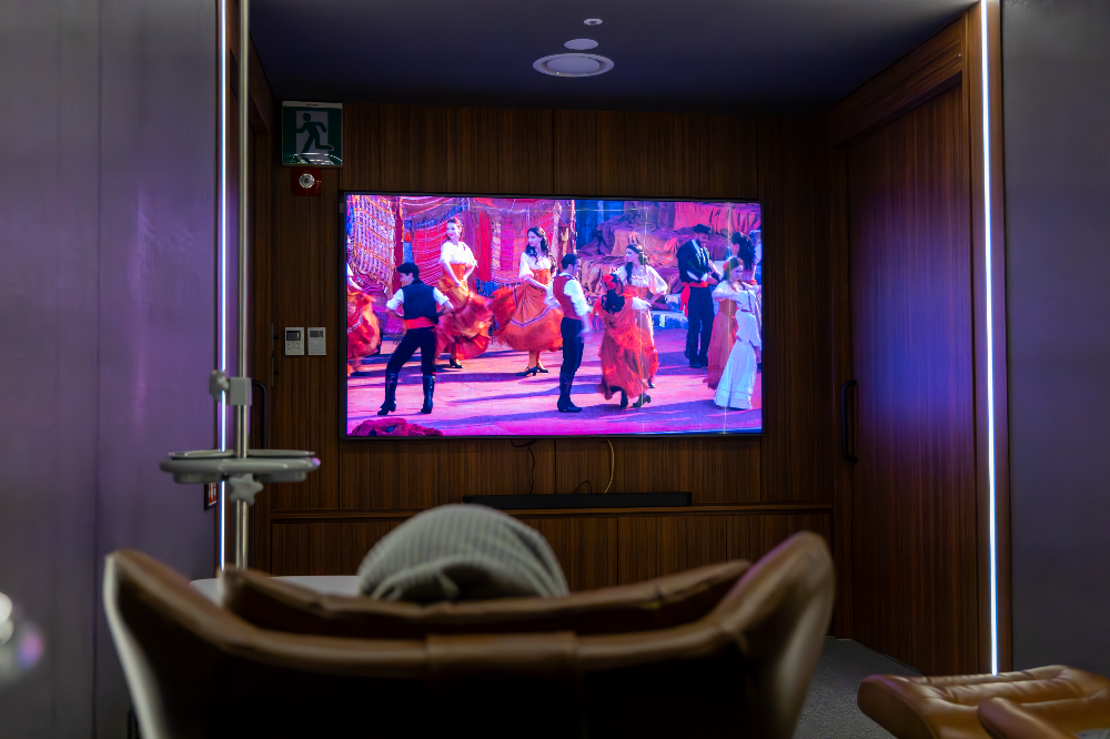 미디어룸 또한 지하는 외래공간으로 벽에 예술 작품을 설치했다. 중앙에는 미디어월로 시선을 단번에 사로잡으며 안락한 분위기를 드러낸다. 그 옆에는 간호스테이션이 위치해 있고 진료실을 지하에 둔 것 특징이다. 특히 이곳은 고주파 온열치료와 고압산소치료 외에도 약침이나 뜸치료가 가능한 의학·한의학 통합진료 시스템이 갖추어져 있다. 수액 치료를 위한 미디어실은 수액을 맞으면서 영화감상과 음악감상을 할 수 있고, 요가룸은 4인씩 참여할 수 있도록 맞춤 프로그램으로 진행한다. 또한 명상 수업은 명상전문가의 지도 하에 환자들의 마음에 치유와 힐링의 시간을 갖도록 했다.