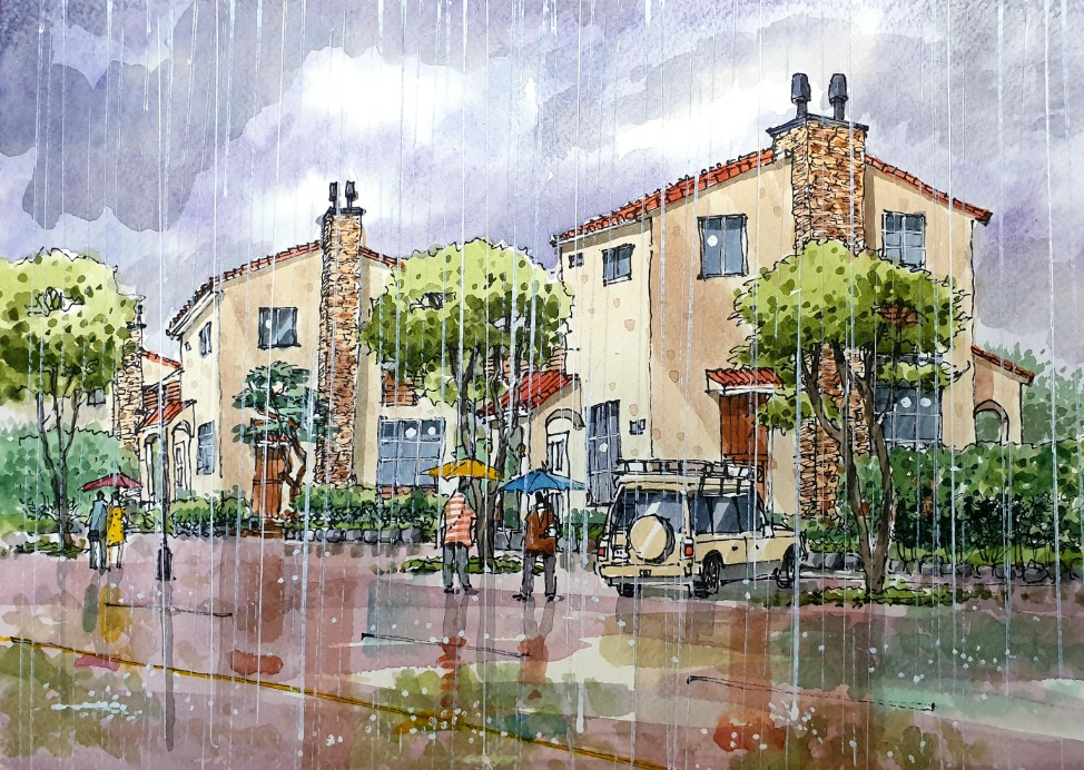 아산집4 아산 봉재저수지 인근에 아름다운 호반을 전망하는 집들이 많은데 그중 몇 채를 디자인한 적이 있다. 아주 오래전에 고교 동창인 친구가 부탁해서 개략적인 개념스케치를 해주었더니 6채를 지었는데 15 여 년이 지난 지금도 예쁜 정원과 함께 담장 없이 커뮤니티를 이루고 있다. 주로 평택 미군기지에서 일하는 외국인들에게 임대주택으로 인기가 좋다. 친구는 조경에 관심과 재능이 많아 가드닝에 정성을 쏟았고 세월이 많이 지났지만 여전히 잘 가꾸어져 있다. 최근에는 커피샵과 야외웨딩 장소도 오픈해서 핫플이 되었고 주말에는 방문객들이 늘고 있다고 한다. 이 그림들은 기념으로 친구에게 선물했고 그 커피샵 벽면에 전시되어 있다.