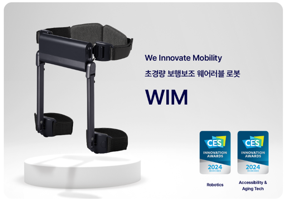초경량 보행보조 로봇 ‘WIM’ / 출처 : 위로보틱스 홈페이지 초경량 보행보조 웨어러블 로봇인 ‘WIM(We Innovate Mobility)’는 인체공학적인 디자인으로 설계되어 인체의 순응 조인트에 의한 모션 제한 최소화로 가벼우면서도 복합적인 움직임이 가능한 제품이다. 이 제품은 1.6kg의 가벼운 소재로 벨트처럼 혼자 쉽게 착용하고 해제할 수 있어 고지대나 장거리 산행, 고령자의 일상 보조도구 등 생활에 자연스럽게 녹아들어 이용할 수 있는 제품으로, 수원시 영통구 보건소, 수원시 광교 2동 행정복지센터, 수원삼성 노블카운티 외 개인 체험자들과 함께 사용성을 테스트하고 그 효과를 시각적으로 인증해냈다.