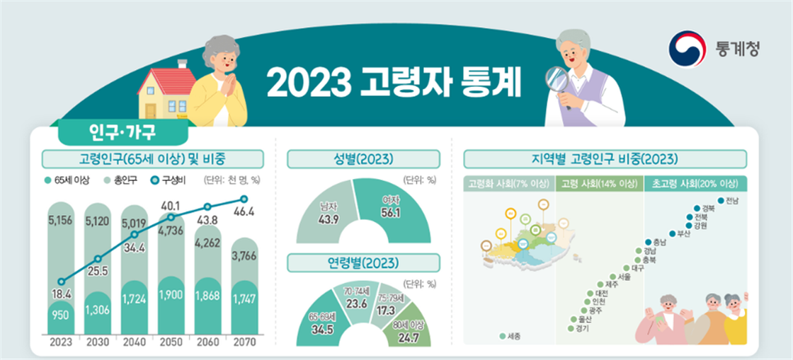 2023 고령자 통계 자료 일부 / 출처 : 통계청 우리나라는 65세 이상 고령인구의 비율이 2018년에 14%를 넘어서면서 본격적인 고령화 사회가 시작되었다. 행정안전부가 발표한 주민등록 인구 통계 자료(지난해 말 기준)에 따르면 이미 지난 해 70세 이상 인구 비율이 20대를 추월했다. 또한, 통계청 자료에서는 내년에는 65세 인구 비율이 전체의 20% 이상을 차지할 것이라 예측되고 있다.