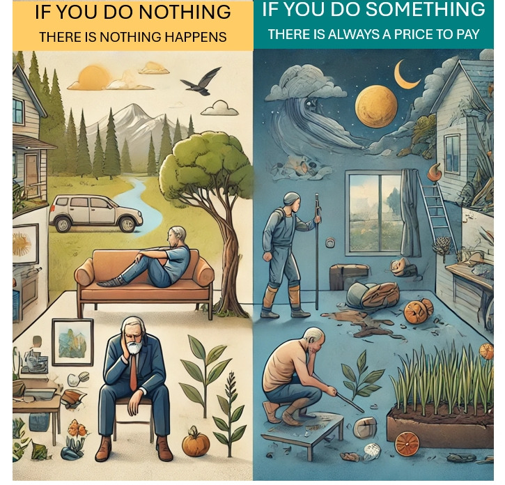 이와 같이 인생의 모든 영역에서 '아무것도 하지 않으면 아무 일도 일어나지 않는다'와 '무슨 일을 하면 반드시 대가를 치러야 한다'라는 두 명제는 상호 보완적입니다. 인생에서 어떤 길을 선택하든, 그것은 필연적으로 선택에 따르는 결과를 낳습니다. 아무것도 하지 않으면 삶은 정체되고, 무언가를 선택하고 행동한다면 그에 따른 대가를 치러야 합니다. 중요한 것은 우리가 무엇을 선택하든, 충동적으로 결정해서는 안 된다는 것이죠. 그 선택으로 인한 기회와 위기, 성과와 실패의 양면성을 깊이 인식하고 그것이 내가 감내할만한 수준인지 따져본 다음 그 선택의 결과를 받아들이고, 그것이 우리에게 어떤 의미를 주는지 이해해야 합니다. 결국 인생은 단순히 무엇을 얻느냐의 문제가 아니라, 어떤 대가를 치르더라도 그것을 기꺼이 감수할 가치가 있는지를 판단하는 것이 아닐까요? 당신의 선택을 응원합니다!