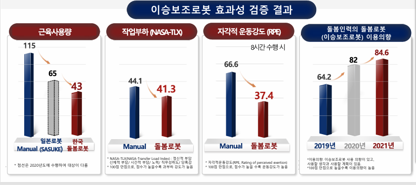 경희대학교는 노인돌봄인력 돌봄업무부담 감소를 위한 돌봄로봇(이승보조로봇) 효과성을 검증하기 위해 자체 조사를 실시했다. 조사대상자는 요양보호사 15명, 일반성인(환자역할) 4명이며, 기간은 2021년 11월 08일부터 11월 17일까지 진행했다. 실증장소는 경희대학교 AgeTech 리빙랩이며, 측정항목으로는 근육사용량, 자각적운동강도(RPE), 작업부하(NASA-TLX)다. 그 결과, 사람이 사람을 드는 동작보다 이승보조로봇 사용 시 근육사용량, 작업부하, 자각적 운동강도가 감소했음을 확인할 수 있었다.