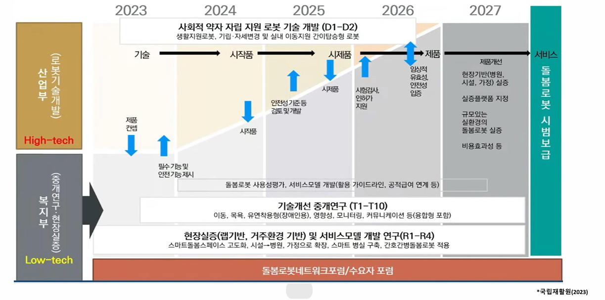돌봄로봇 R&D 연구진행(2019~2022, 2023~2027) 사항은 아래 그림에서 확인할 수 있다.