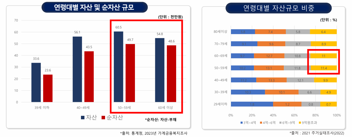 베이비부머 및 노인세대의 평균 자산 규모를 살펴봤을 때, 전체 세대 중에서 50~60대의 자산이 가장 높은 비중을 차지하고 있으며, 자산 9억을 초과한 비중 역시 50~60대가 가장 많았다. 특히 50대 가구의 자산이 6억 5백만 원 및 순자산이 4억 9천만 원으로 가장 많은 자산과 순자산을 보유한 것으로 드러났다. 60세 이상 가구의 자산은 5억 4천만 원이며, 순자산(4억 8천만 원)은 두 번째로 많은 것으로 확인됐다.