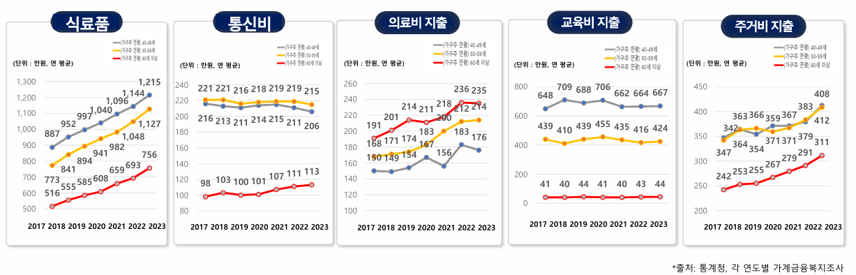 연령 집단에 따른 전반적인 지출 항목 변화에서는, 전 연령대에서 식료품 지출 비중이 가장 크게, 꾸준히 증가하고 있음을 알 수 있다. 통신비의 경우, 50대가 지출이 가장 크며, 60세 이상은 19년부터 꾸준히 증가하여 가장 큰 증가율 보였다. 또한 의료비의 경우, 60세 이상의 지출이 가장 크며, 50대의 의료비 지출 역시 꾸준히 증가하고 있는 것으로 나타났다. 교육비의 경우는, 60세 이상의 지출이 다소 낮으나, 2021년도부터 증가 추세를 보이고 있다. 주거비는 40대, 50대, 60세 이상의 지출이 꾸준히 증가하고 있음을 알 수 있다.