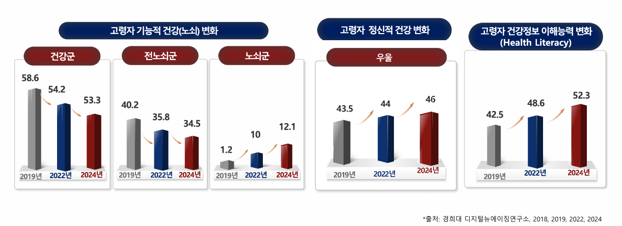 우리나라 고령자들은 코로나19 이전인 5년 전에 비해 실제로 신체적 건강, 주관적 건강이 낮아지고 있는 것으로 나타났다. 19년도 이후 건강군과 전노쇠군은 꾸준히 감소하고, 노쇠군은 증가하고 있다. 또한 19년도 이후 고령자의 주관적 건강 상태도 감소 추세를 보이고 있는 반면, 고령자의 건강 정보 이해 능력(헬스리터러시)은 증가하고 있는 것으로 나타났다.