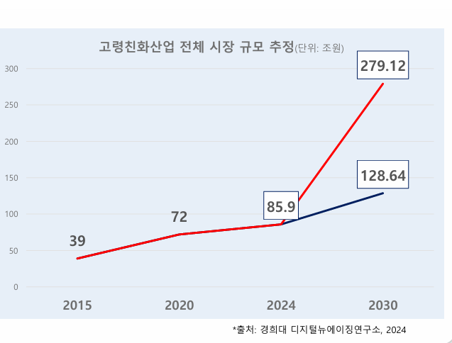 한국은 고령친화산업 규모가 2030년 128조에서 최대 280조로 성장할 것으로 전망된다. 경희대학교 디지털뉴에이징연구소의 2024년 조사 결과에서는 한국 고령자를 전체 적용했을 때, 고령친화산업 규모가 85조였다(디지털뉴에이징연구소 조사 토대로 전국 노인 인구수(통계청) 및 가구원 규모(노인실태조사)를 적용하여, 경희대 고령친화산업보고서(2019) 전체 고령친화산업별 예상증가율 반영하여 추정함).