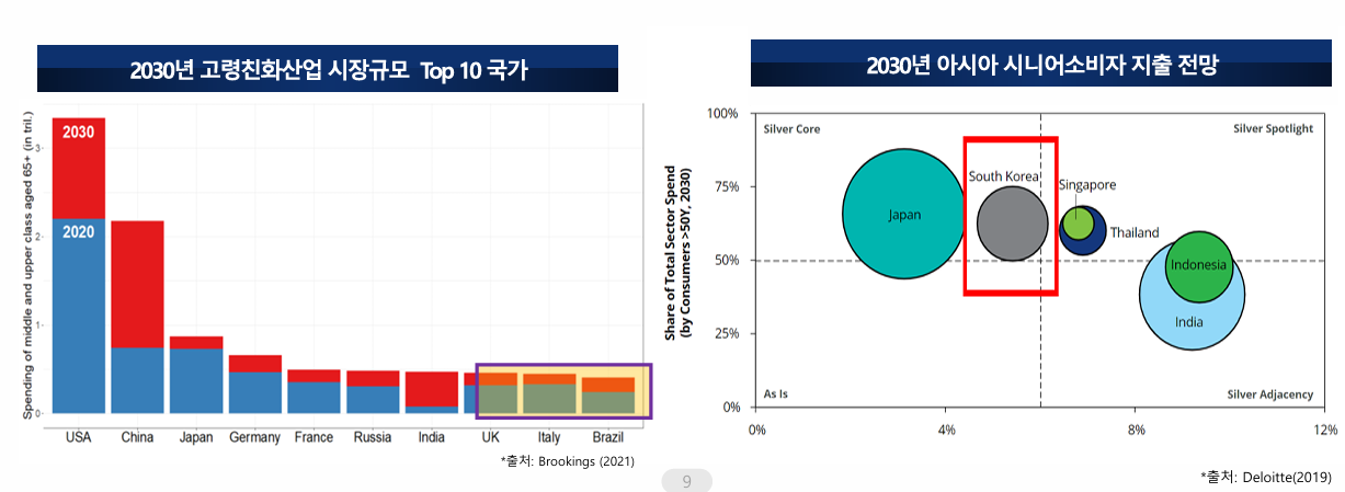 2030년 고령친화산업 글로벌 시장은 미국, 아시아(중국의 점유율이 가장 크게 증가), EU 순서(Brookings, 2021)로 진행될 것으로 보인다. 아시아에서는 6개국에서 2030년 제품 및 서비스에 대한 시니어 소비자 지출을 예측하여, 고령화가 미래 경제에 미칠 영향에 대한 관점을 제공하고 있다. 특히 실버 경제와 관련해서 전체 인구의 지출 점유율과 소비 연간 성장률이 모두 높은(Silver Spotlight) 한국, 싱가포르 및 태국은 기업들이 실버 경제로 전환하기 시작해야 한다고 보고 있다.