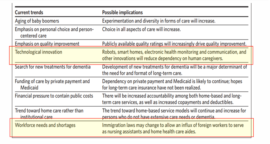 향후 노인요양 서비스는 베이비부머 세대의 은퇴, 개인의 선택 존중 등과 더불어 부족한 요양인력을 대체하기 위한 로봇, 스마트홈 등 기술적 혁신이 함께 진행될 것으로 예측된다(Philip et al, 2014). *출처: Philip et al(2014) What Will Long-Term Care Be Like in 2040